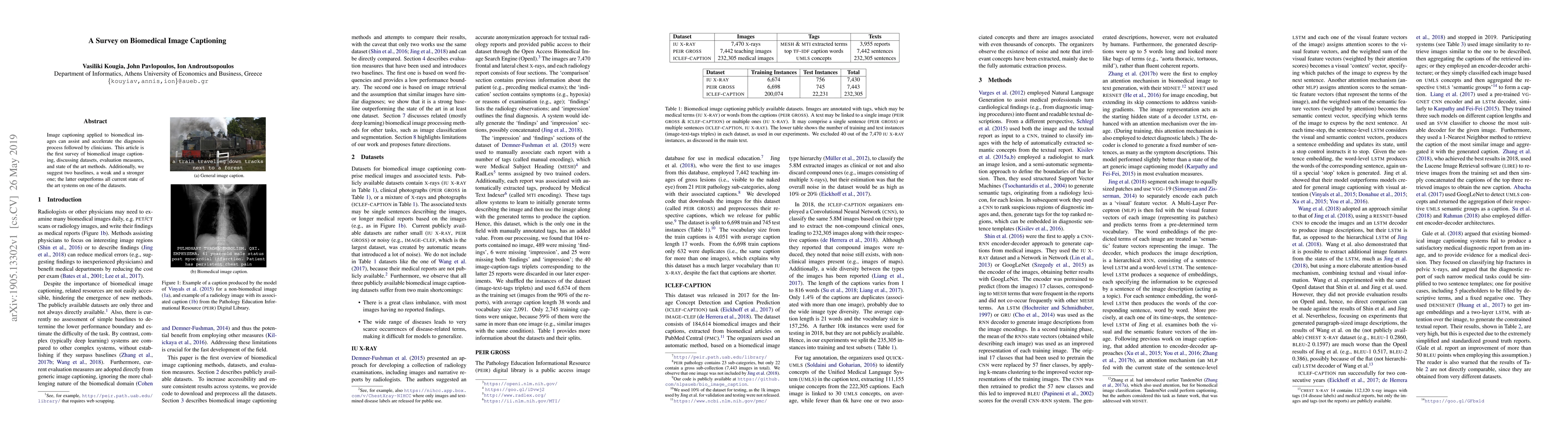 This survey explores biomedical image captioning to aid diagnosis, discussing datasets, evaluation methods, and state-of-the-art approaches. A strong baseline system outperforms existing methods on one dataset.