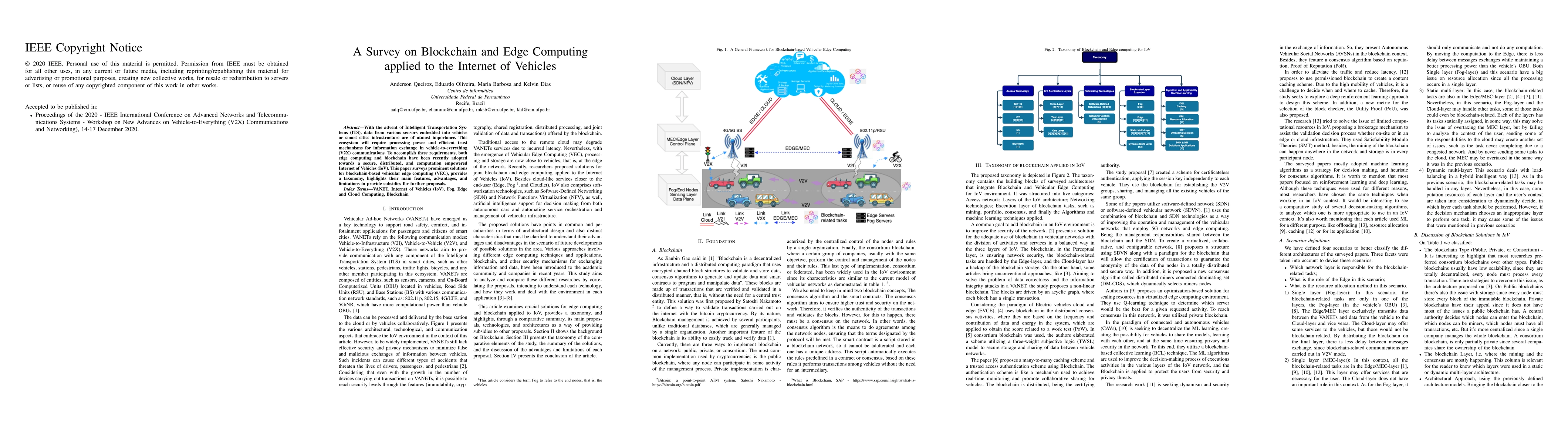 With the advent of Intelligent Transportation Systems (ITS), data from diverse sensors either embedded into the vehicles or present along with the smart city infrastructure, are of utmost importance and require both processing power and efficient trust mechanisms for information exchange in vehicle-to-everything (V2X) communications. To accomplish these requirements, both edge computing and blockchain have been recently adopted towards a secure, distributed, and computation empowered Internet of Vehicles (IoV). This paper surveys prominent solutions for blockchain-based vehicular edge computing (VEC), provides a taxonomy, highlights their main features, advantages, and limitations to provide subsidies for further proposals.