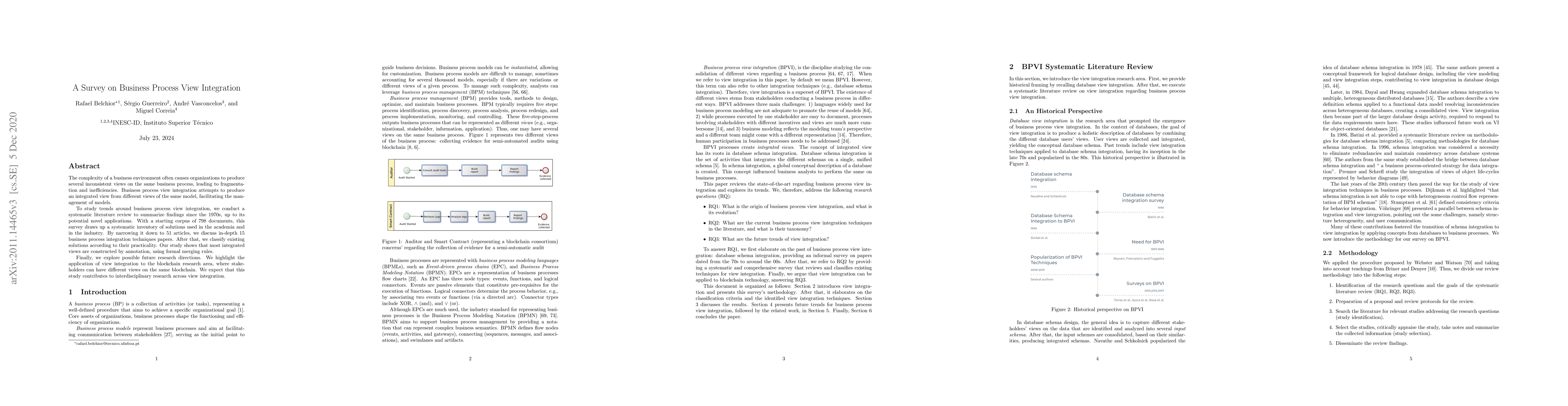 This study reviews 51 articles on business process view integration to summarize techniques used in academia and industry, highlighting the application of view integration to blockchain research and potential future directions.