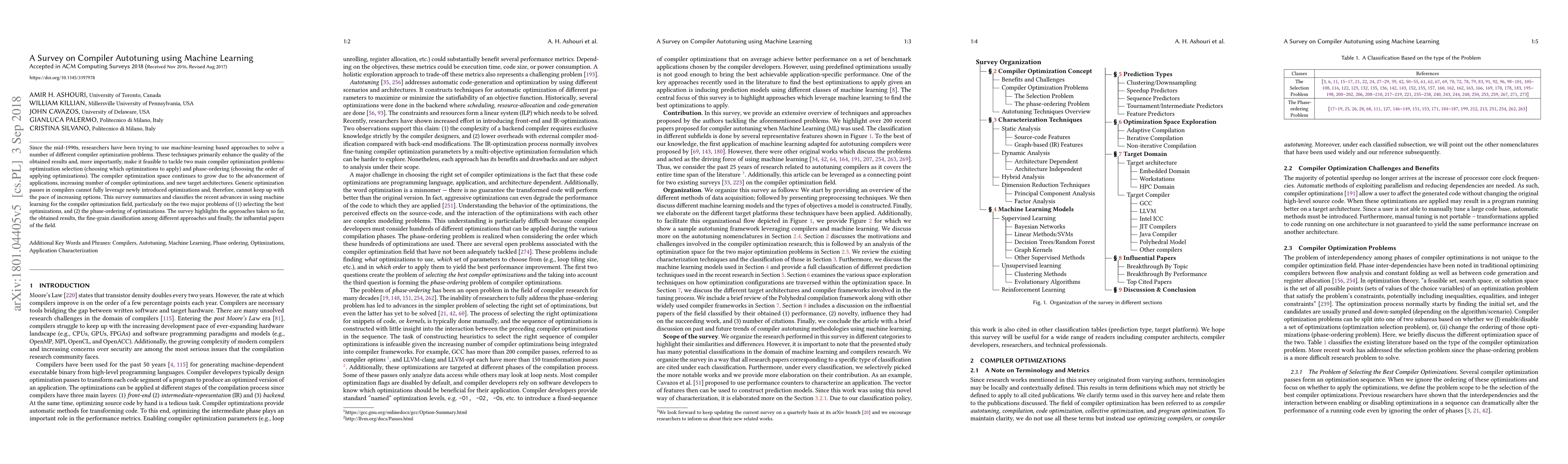 This survey reviews recent advances in using machine learning to tackle compiler optimization problems, focusing on optimization selection and phase-ordering. It classifies various approaches, highlights their results, and identifies influential papers in the field.