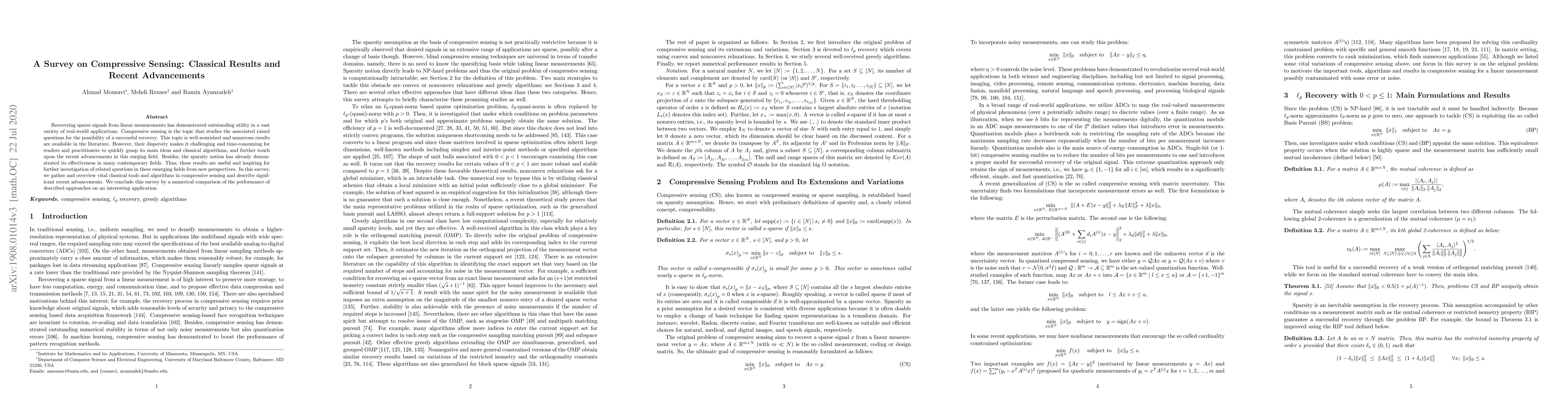 This survey review of compressive sensing discusses classical results and recent advancements in recovering sparse signals from linear measurements. It provides an overview of key tools, algorithms, and performance comparisons for various applications.