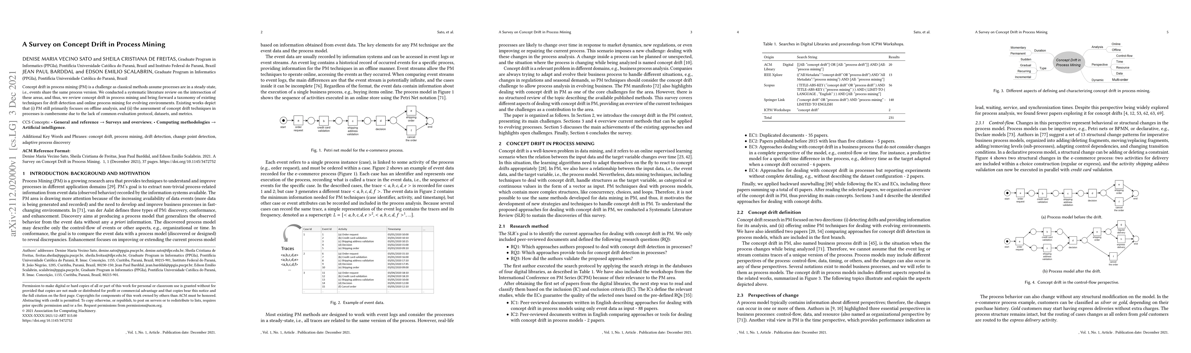 This paper reviews concept drift in process mining, highlighting the challenge of evolving processes and the lack of standardized evaluation protocols. It proposes a taxonomy of techniques for detecting drift and conducting online process mining.