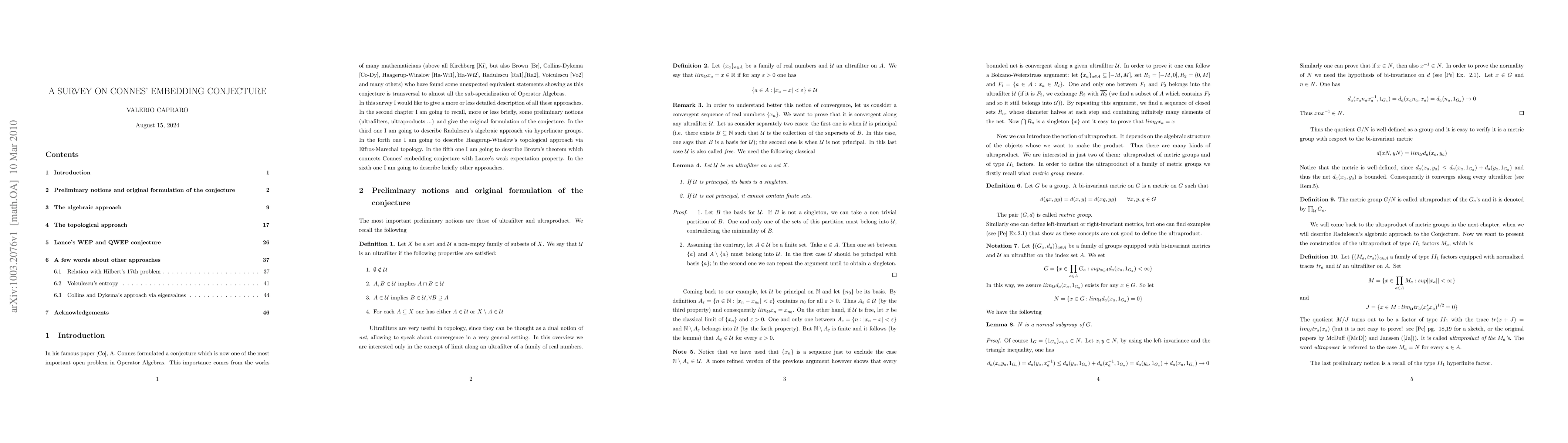This survey explores Connes' Embedding Conjecture, a pivotal unsolved problem in Operator Algebras, highlighting its significance and the various equivalent statements found by numerous mathematicians that underscore its interdisciplinary impact within the field.