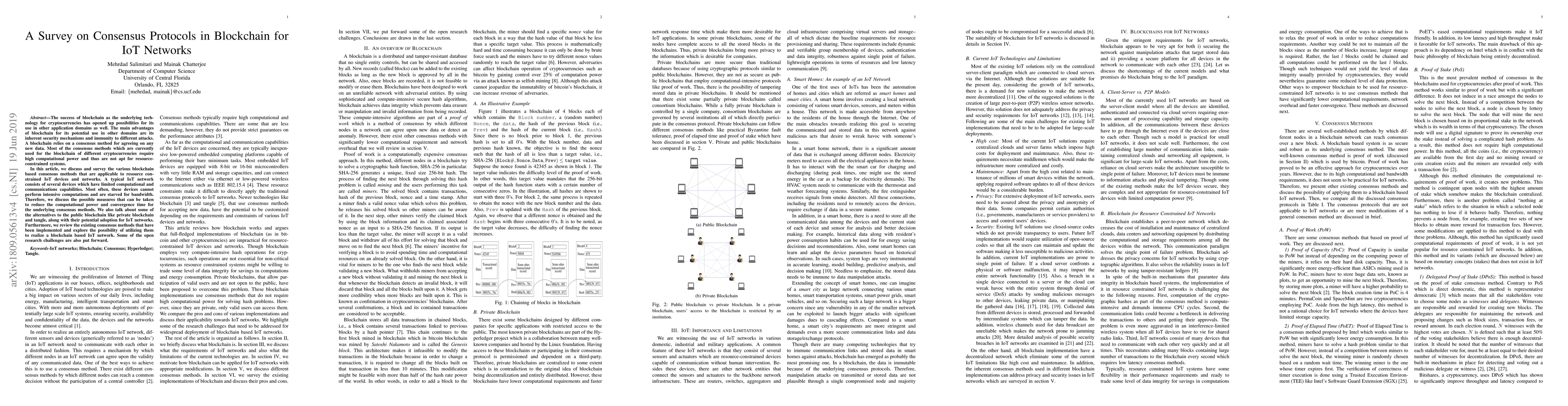 This paper surveys consensus protocols suitable for blockchain in IoT networks, highlighting the limitations of traditional consensus methods for resource-constrained devices. It discusses alternatives like private blockchains and tangles, and explores existing consensus implementations for potential IoT applications, while also identifying open research challenges.