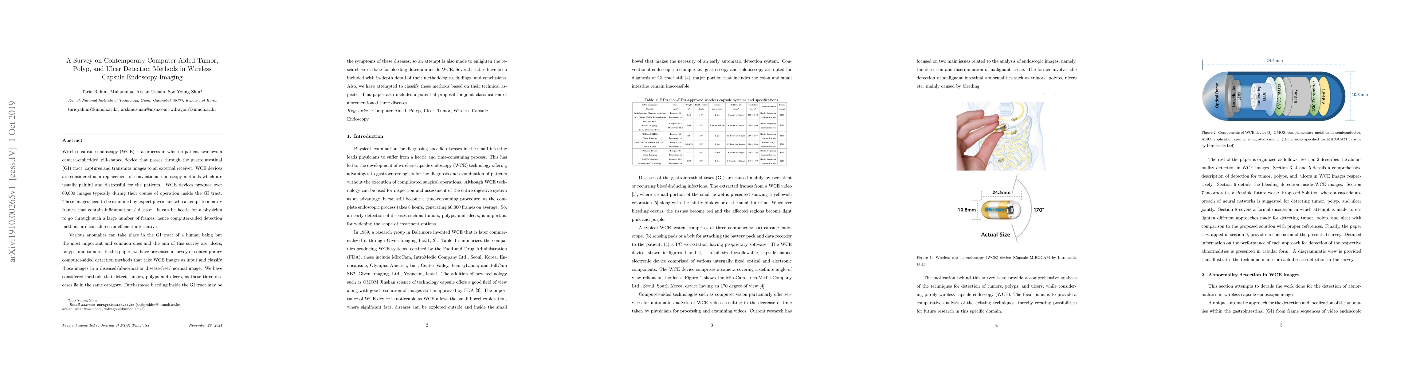Wireless capsule endoscopy (WCE) is a process in which a patient swallows a camera-embedded pill-shaped device that passes through the gastrointestinal (GI) tract, captures and transmits images to an external receiver. WCE devices are considered as a replacement of conventional endoscopy methods which are usually painful and distressful for the patients. WCE devices produce over 60,000 images typically during their course of operation inside the GI tract. These images need to be examined by expert physicians who attempt to identify frames that contain inflammation / disease. It can be hectic for a physician to go through such a large number of frames, hence computer-aided detection methods are considered an efficient alternative. Various anomalies can take place in the GI tract of a human being but the most important and common ones and the aim of this survey are ulcers, polyps, and tumors. In this paper, we have presented a survey of contemporary computer-aided detection methods that take WCE images as input and classify those images in a diseased/abnormal or disease-free/ normal image. We have considered methods that detect tumors, polyps and ulcers, as these three diseases lie in the same category. Furthermore bleeding inside the GI tract may be the symptoms of these diseases; so an attempt is also made to enlighten the research work done for bleeding detection inside WCE. Several studies have been included with in-depth detail of their methodologies, findings, and conclusions. Also, we have attempted to classify these methods based on their technical aspects. This paper also includes a potential proposal for joint classification of aforementioned three diseases.