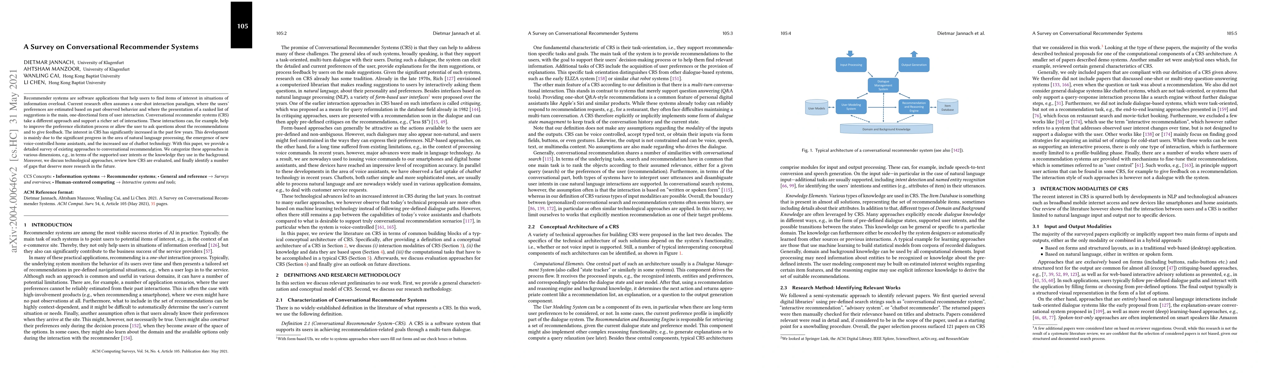 Recommender systems are software applications that help users to find items of interest in situations of information overload. Current research often assumes a one-shot interaction paradigm, where the users' preferences are estimated based on past observed behavior and where the presentation of a ranked list of suggestions is the main, one-directional form of user interaction. Conversational recommender systems (CRS) take a different approach and support a richer set of interactions. These interactions can, for example, help to improve the preference elicitation process or allow the user to ask questions about the recommendations and to give feedback. The interest in CRS has significantly increased in the past few years. This development is mainly due to the significant progress in the area of natural language processing, the emergence of new voice-controlled home assistants, and the increased use of chatbot technology. With this paper, we provide a detailed survey of existing approaches to conversational recommendation. We categorize these approaches in various dimensions, e.g., in terms of the supported user intents or the knowledge they use in the background. Moreover, we discuss technological approaches, review how CRS are evaluated, and finally identify a number of gaps that deserve more research in the future.