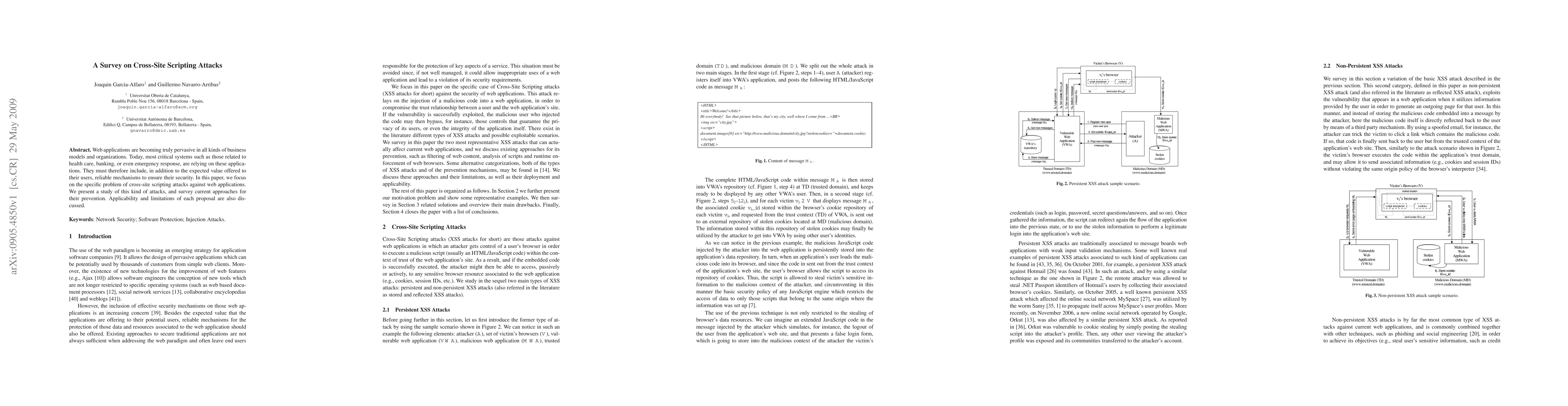This paper surveys cross-site scripting (XSS) attacks targeting web applications, focusing on current prevention approaches and discussing their applicability and limitations. It highlights the critical need for robust security measures in increasingly pervasive web-based systems.