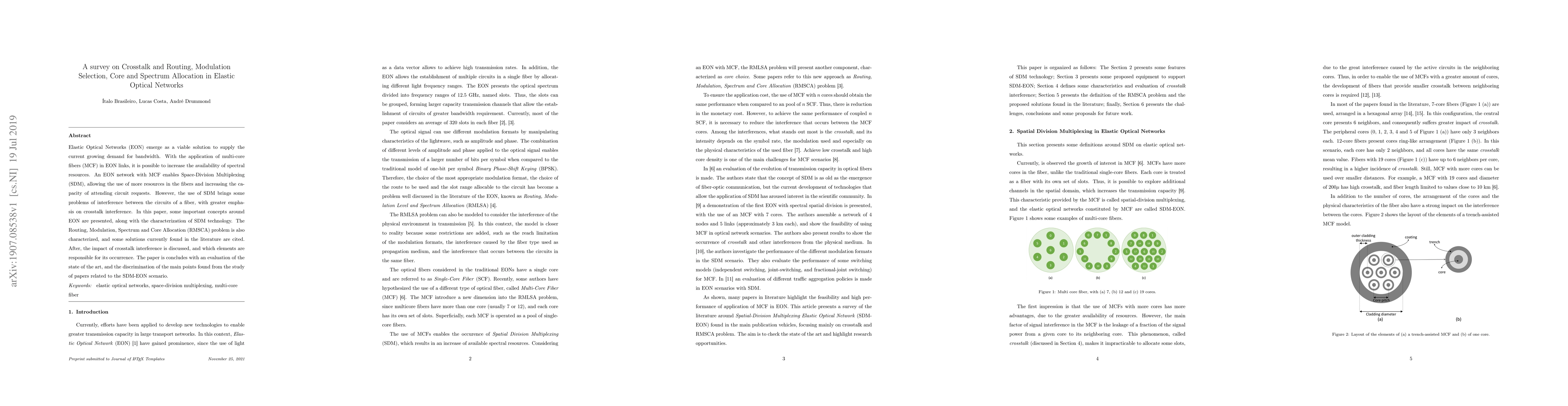 Elastic Optical Networks (EON) emerge as a viable solution to supply the current growing demand for bandwidth. With the application of multi-core fibers (MCF) in EON links, it is possible to increase the availability of spectral resources. An EON network with MCF enables Space-Division Multiplexing (SDM), allowing the use of more resources in the fibers and increasing the capacity of attending circuit requests. However, the use of SDM brings some problems of interference between the circuits of a fiber, with greater emphasis on crosstalk interference. In this paper, some important concepts around EON are presented, along with the characterization of SDM technology. The Routing, Modulation, Spectrum and Core Allocation (RMSCA) problem is also characterized, and some solutions currently found in the literature are cited. After, the impact of crosstalk interference is discussed, and which elements are responsible for its occurrence. The paper is concludes with an evaluation of the state of the art, and the discrimination of the main points found from the study of papers related to the SDM-EON scenario.