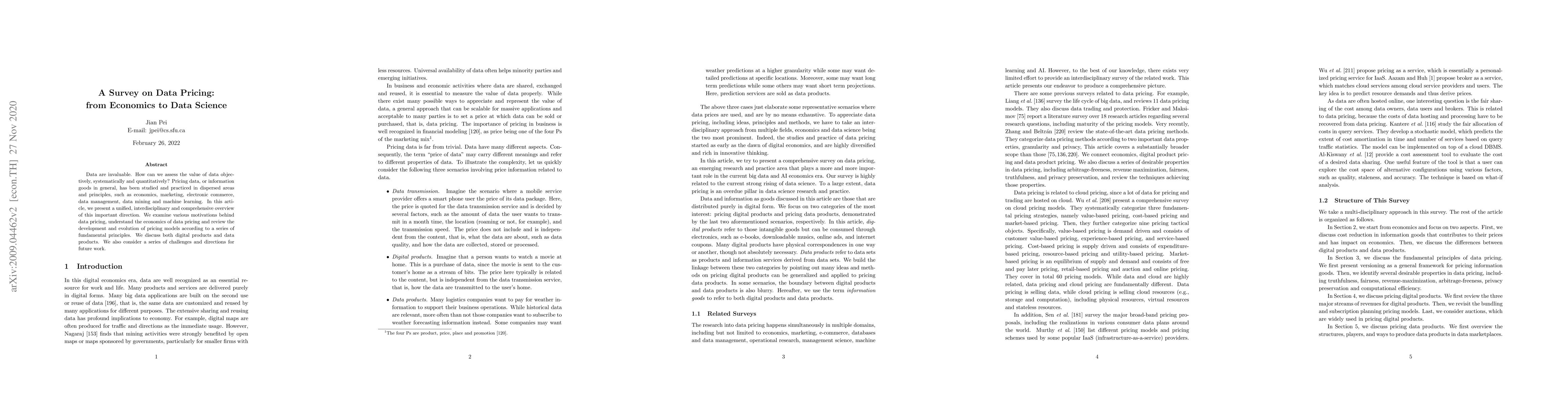 Data are invaluable. How can we assess the value of data objectively, systematically and quantitatively? Pricing data, or information goods in general, has been studied and practiced in dispersed areas and principles, such as economics, marketing, electronic commerce, data management, data mining and machine learning. In this article, we present a unified, interdisciplinary and comprehensive overview of this important direction. We examine various motivations behind data pricing, understand the economics of data pricing and review the development and evolution of pricing models according to a series of fundamental principles. We discuss both digital products and data products. We also consider a series of challenges and directions for future work.