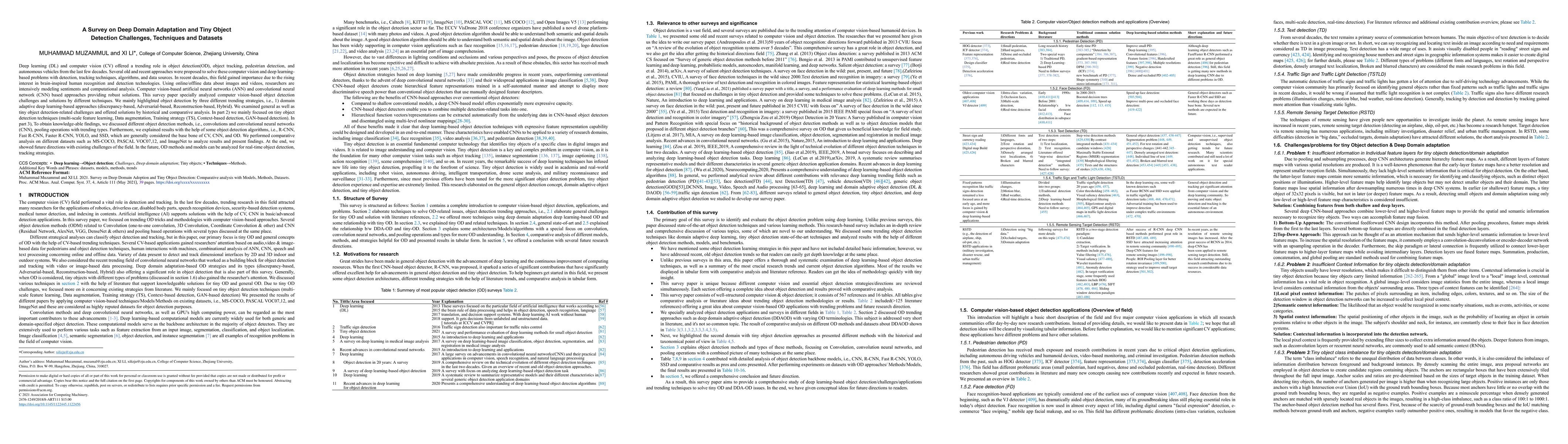 This survey paper explores deep domain adaptation and tiny object detection challenges in computer vision, focusing on various techniques and datasets. It examines domain adaptive deep learning strategies and tiny object detection methods, providing comparative analyses and future directions for real-time object detection and tracking. For detailed insights, refer to the original paper.
