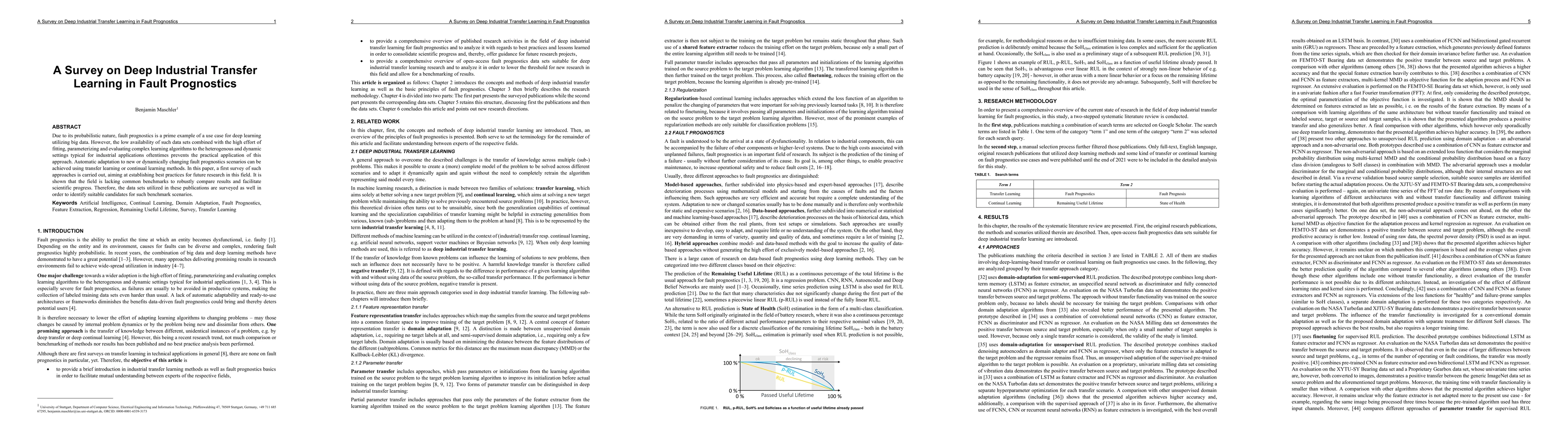 Due to its probabilistic nature, fault prognostics is a prime example of a use case for deep learning utilizing big data. However, the low availability of such data sets combined with the high effort of fitting, parameterizing and evaluating complex learning algorithms to the heterogenous and dynamic settings typical for industrial applications oftentimes prevents the practical application of this approach. Automatic adaptation to new or dynamically changing fault prognostics scenarios can be achieved using transfer learning or continual learning methods. In this paper, a first survey of such approaches is carried out, aiming at establishing best practices for future research in this field. It is shown that the field is lacking common benchmarks to robustly compare results and facilitate scientific progress. Therefore, the data sets utilized in these publications are surveyed as well in order to identify suitable candidates for such benchmark scenarios.