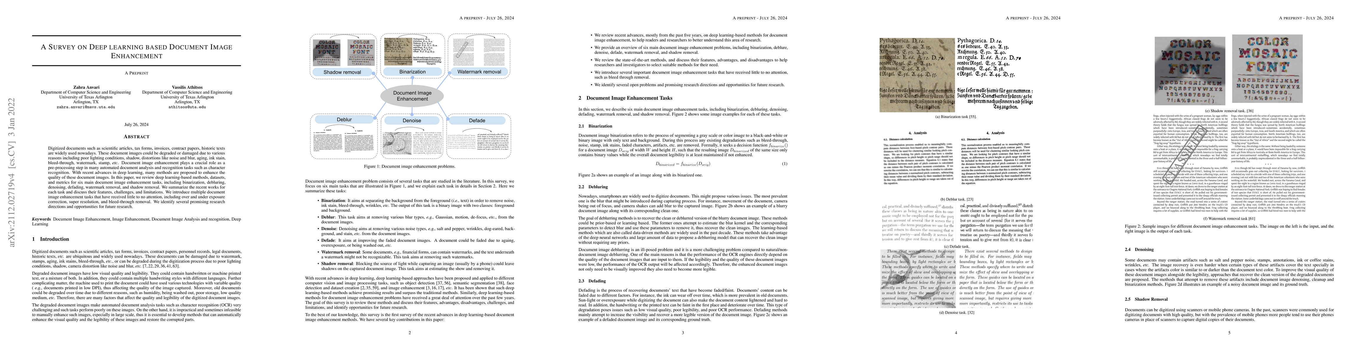 This paper surveys deep learning techniques for enhancing the quality of digitized document images, reviewing methods for tasks like binarization, debluring, and denoising. It highlights recent advances, challenges, and opportunities for future research in under-explored areas such as over/under exposure correction and bleed-through removal.