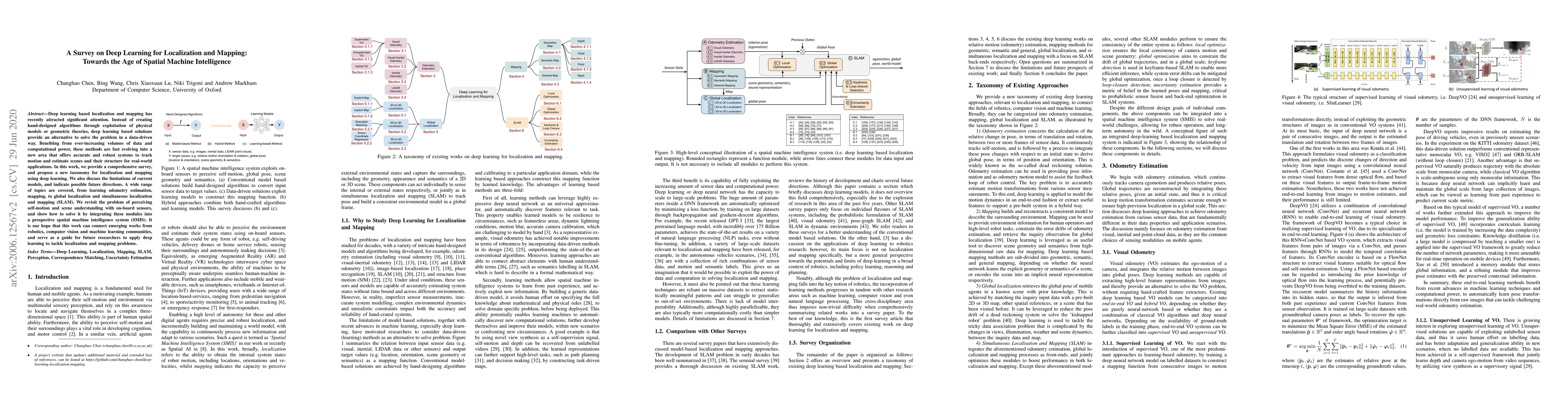 This paper surveys deep learning approaches for localization and mapping, offering a new taxonomy and discussing current limitations and future directions. It aims to integrate modules for self-motion perception and scene understanding into a spatial machine intelligence system, bridging robotics, computer vision, and machine learning fields.
