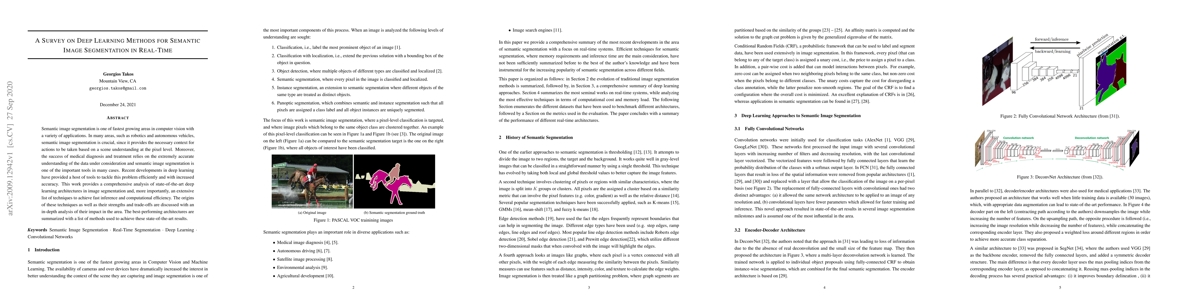 This paper surveys advanced deep learning methods for real-time semantic image segmentation, highlighting state-of-the-art architectures and techniques for achieving fast inference and computational efficiency. It also discusses the strengths and trade-offs of these methods and their impact on applications like robotics and medical diagnosis.