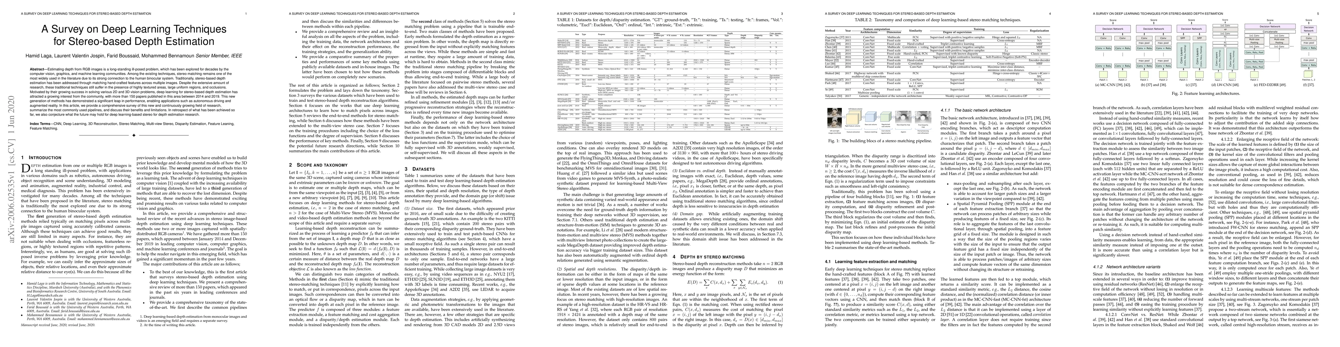 This paper surveys deep learning techniques for stereo-based depth estimation, highlighting the shift from traditional methods to advanced neural networks that significantly improve performance, especially in challenging scenarios. It discusses the benefits and limitations of current approaches and speculates on future directions in this evolving research field.