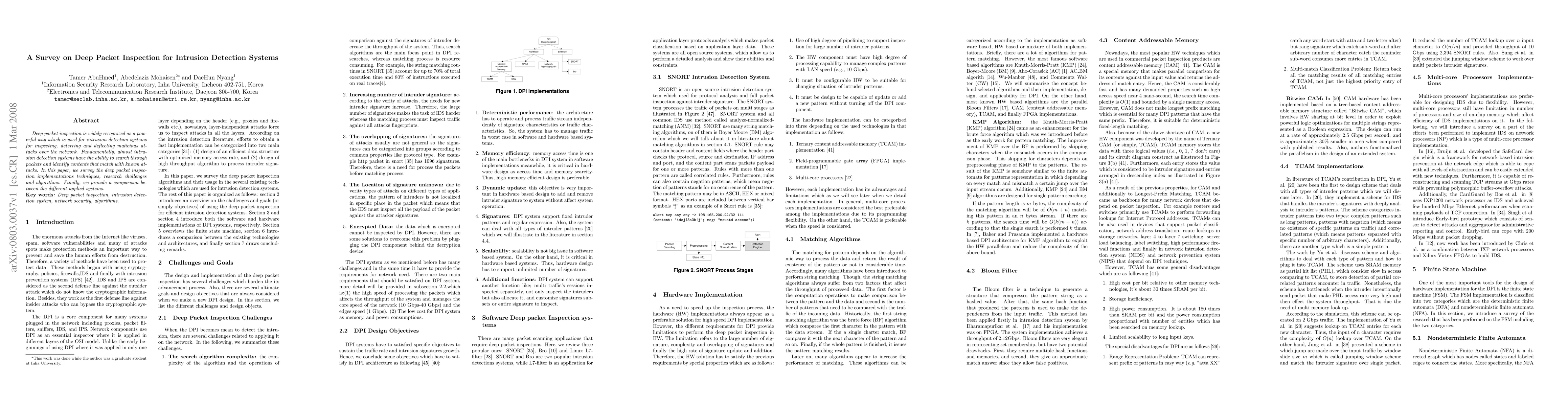 This paper surveys deep packet inspection techniques for intrusion detection systems, highlighting implementation methods, research challenges, and algorithms, and compares various applied systems.