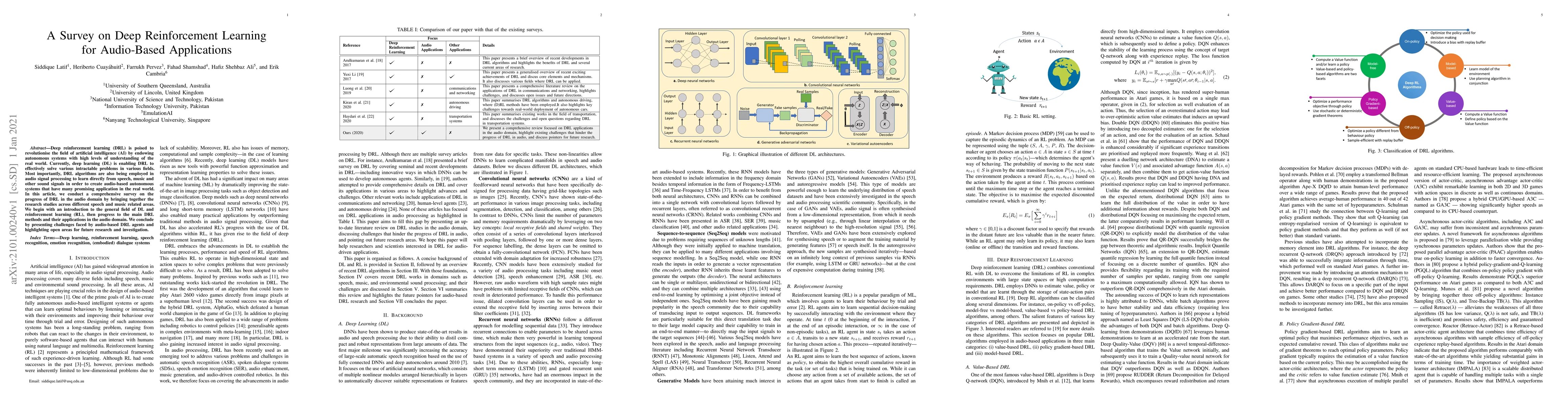 This paper surveys the advancements in deep reinforcement learning (DRL) for audio-based applications, summarizing DRL methods and their applications in speech and music processing, and identifying challenges and future research directions in the field.