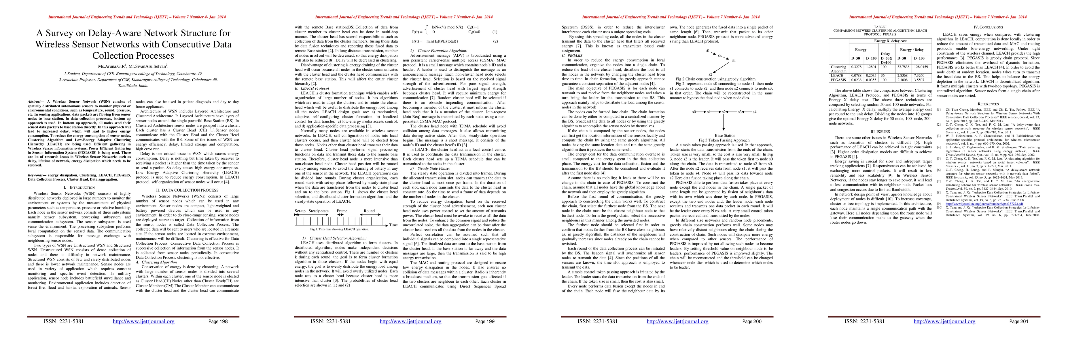 A Wireless Sensor Network (WSN) consists of spatially distributed autonomous sensors to monitor physical or environmental conditions, such as temperature, sound, pressure,etc. In sensing applications, data packets are flowing from sensor nodes to base station. In data collection processes, bottom up approach is used. In bottom up approach, all nodes send their sensed data packets to base station directly. In this approach will lead to increased delay, which will lead to higher energy consumption. To reduce the energy consumption of sensor nodes,Clustering Algorithm and Low-Energy Adaptive Clustering Hierarchy (LEACH) are being used. Efficient gathering in Wireless Sensor information systems, Power Efficient Gathering in Sensor Information System (PEGASIS) is being used. There are lot of research issues in Wireless Sensor Networks such as delay, lifetime of network, energy dissipation which needs to be resolved.