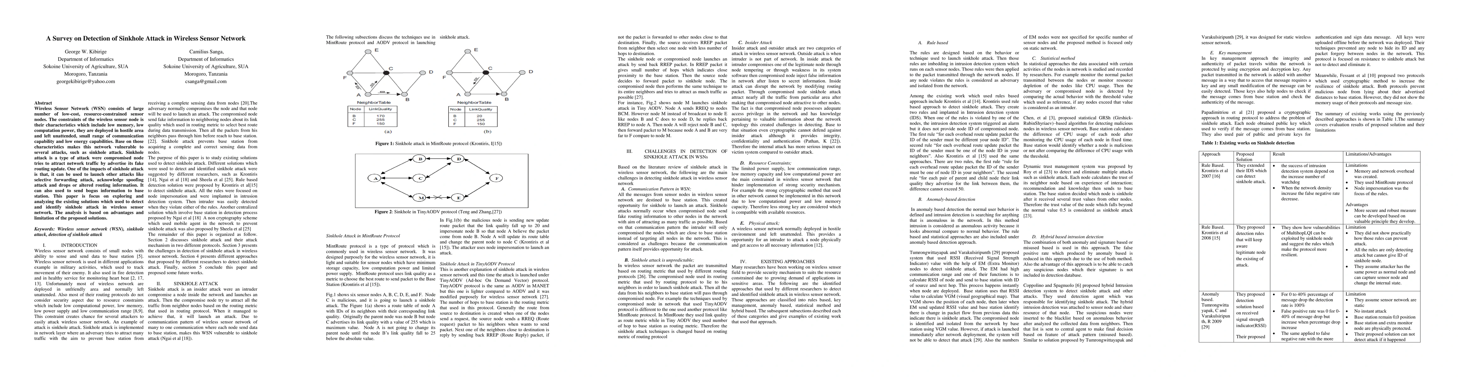 This paper surveys existing detection methods for sinkhole attacks in wireless sensor networks, focusing on their advantages and limitations. It highlights how these attacks exploit network vulnerabilities and the potential for cascading effects, including selective forwarding and spoofing.