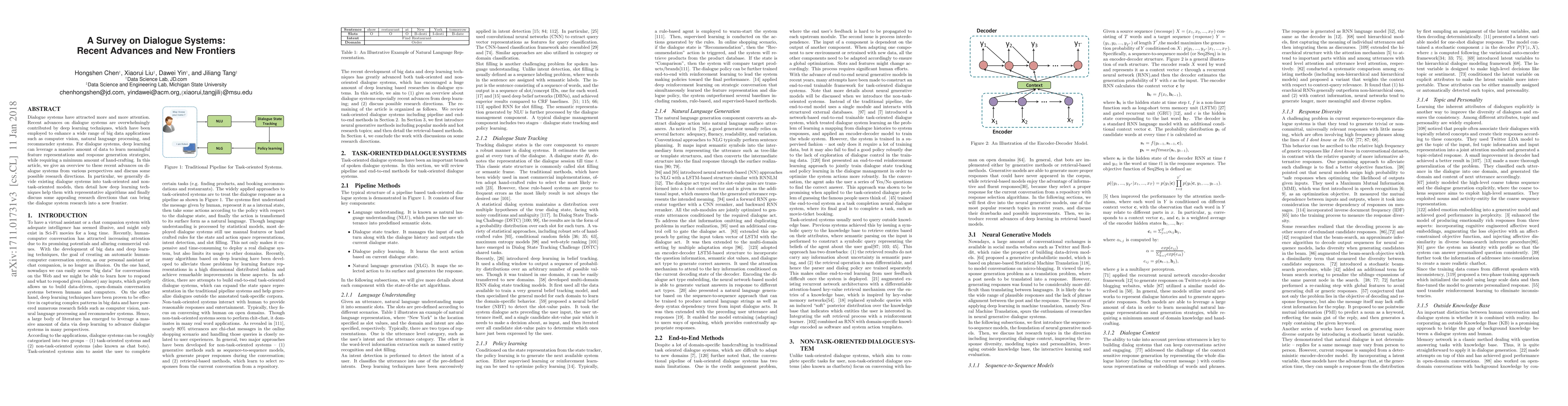 This paper surveys recent advances in dialogue systems, emphasizing the role of deep learning techniques in enhancing both task-oriented and non-task-oriented models. It highlights how deep learning enables effective feature representation and response generation, and discusses potential future research directions.