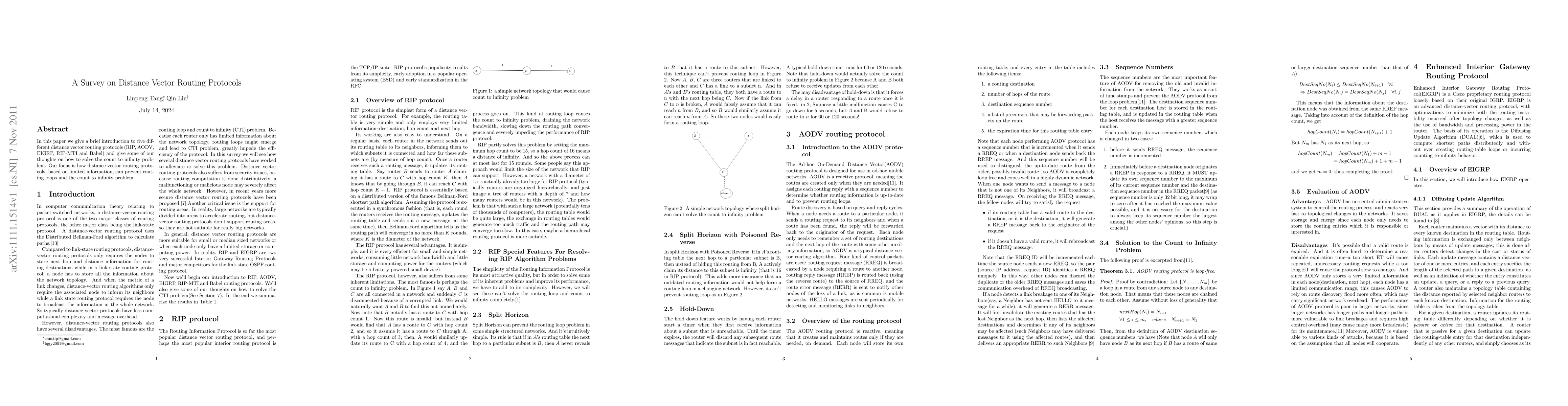 This paper surveys five distance vector routing protocols—RIP, AODV, EIGRP, RIP-MTI, and Babel—highlighting their methods to prevent routing loops and the count to infinity problem, which arises from limited information in these protocols.