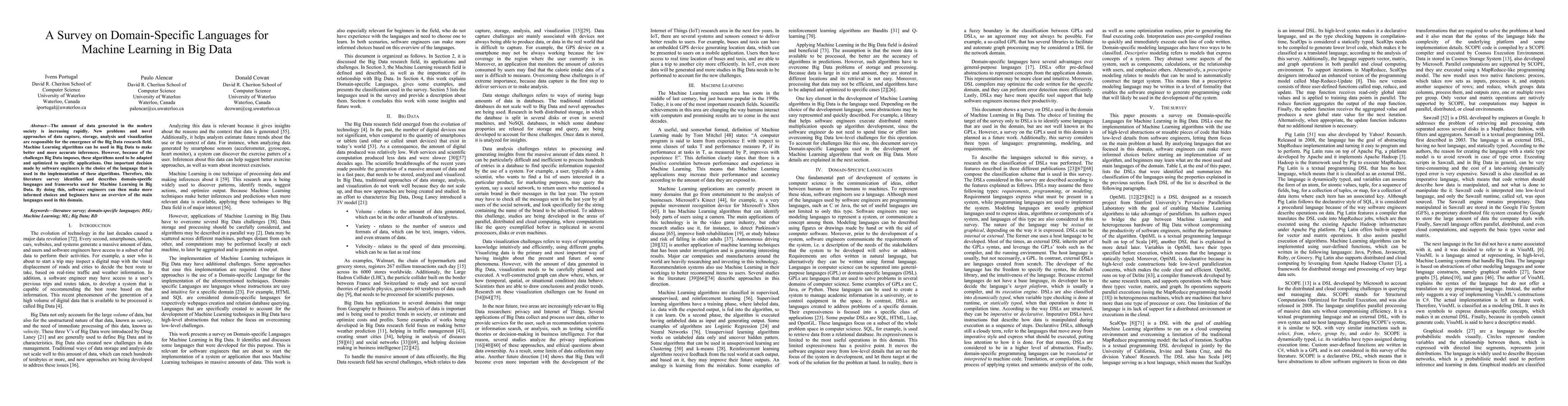 This paper surveys domain-specific languages and frameworks for implementing machine learning algorithms in Big Data contexts. It aims to help software engineers make informed language choices and provide beginners with an overview of the main languages used in this field.