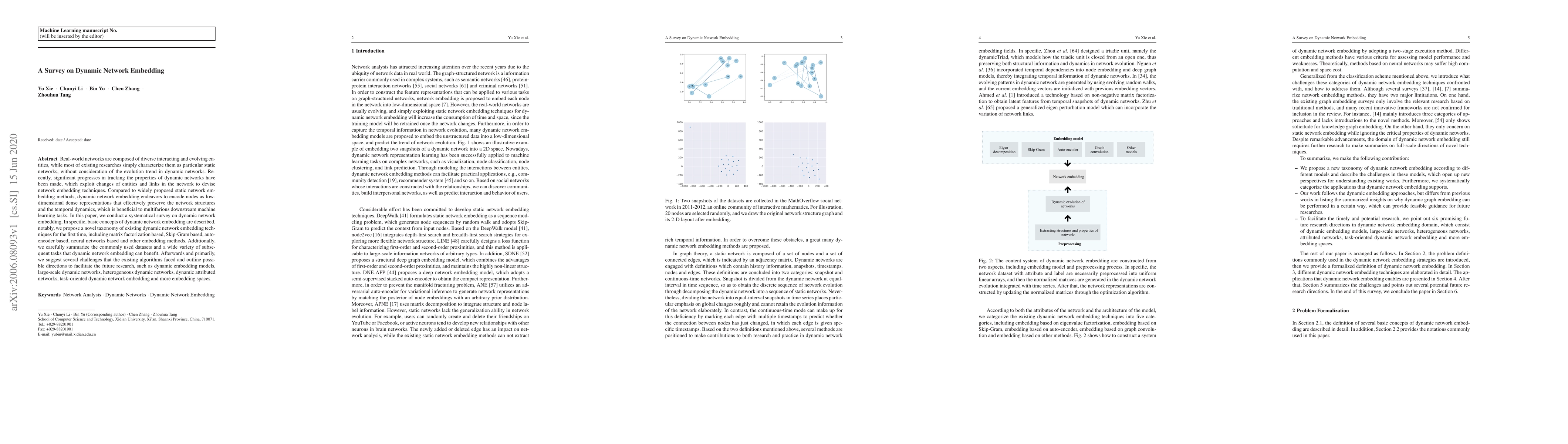 This paper surveys dynamic network embedding techniques, categorizing them into matrix factorization, Skip-Gram, autoencoder, neural networks, and other methods. It highlights challenges and future research directions, including dynamic embedding models and large-scale networks.
