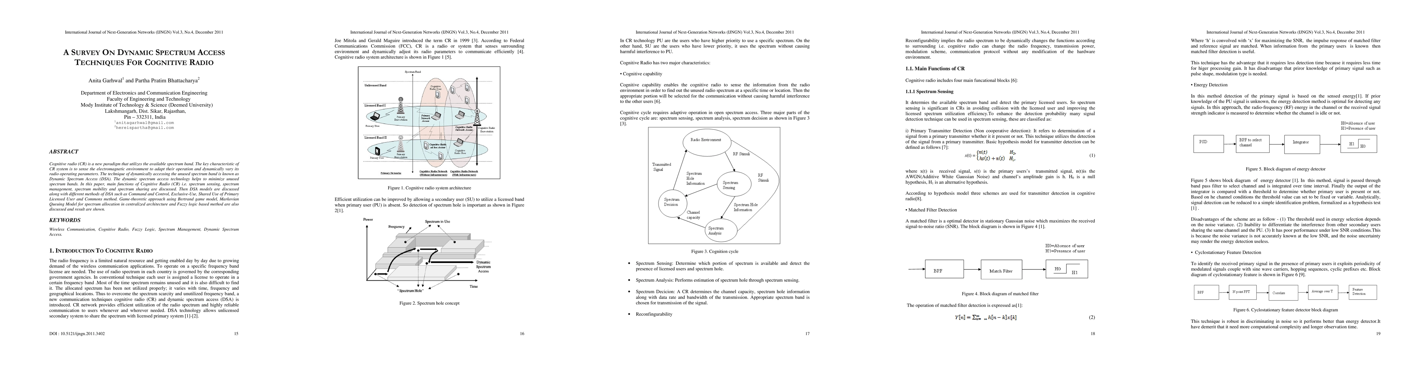 This paper surveys dynamic spectrum access techniques for cognitive radio, focusing on spectrum sensing, management, mobility, and sharing. It discusses various DSA models and methods including Command and Control, Shared Use, and game-theoretic approaches, alongside results from Markovian and fuzzy logic-based spectrum allocation.