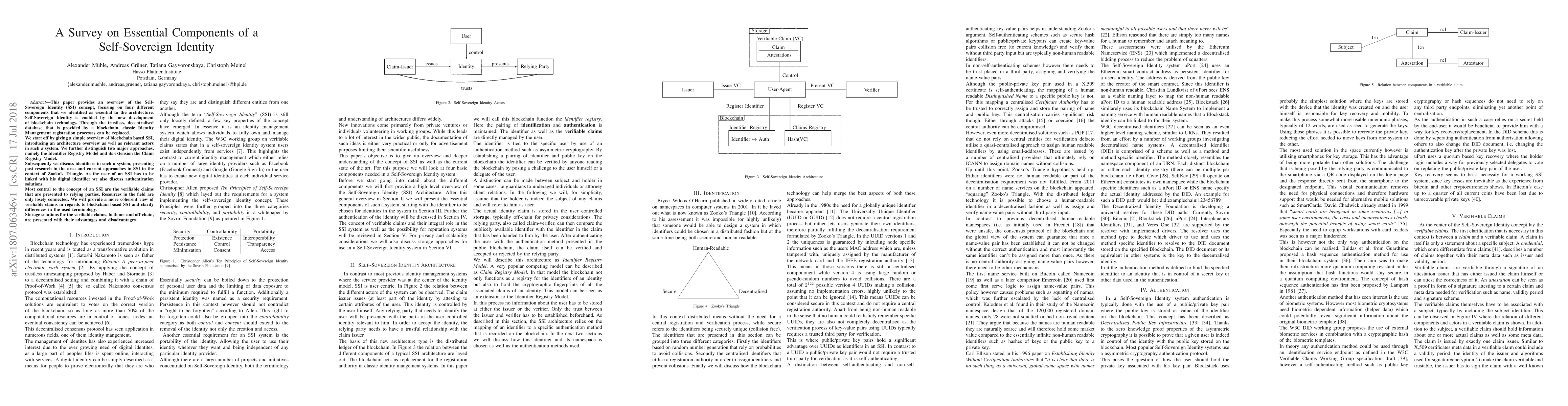 This paper surveys essential components of Self-Sovereign Identity (SSI) enabled by blockchain technology, focusing on the architecture, identifiers, authentication, and verifiable claims, while discussing the Identifier Registry Model and Claim Registry Model. It also evaluates storage solutions for verifiable claims.