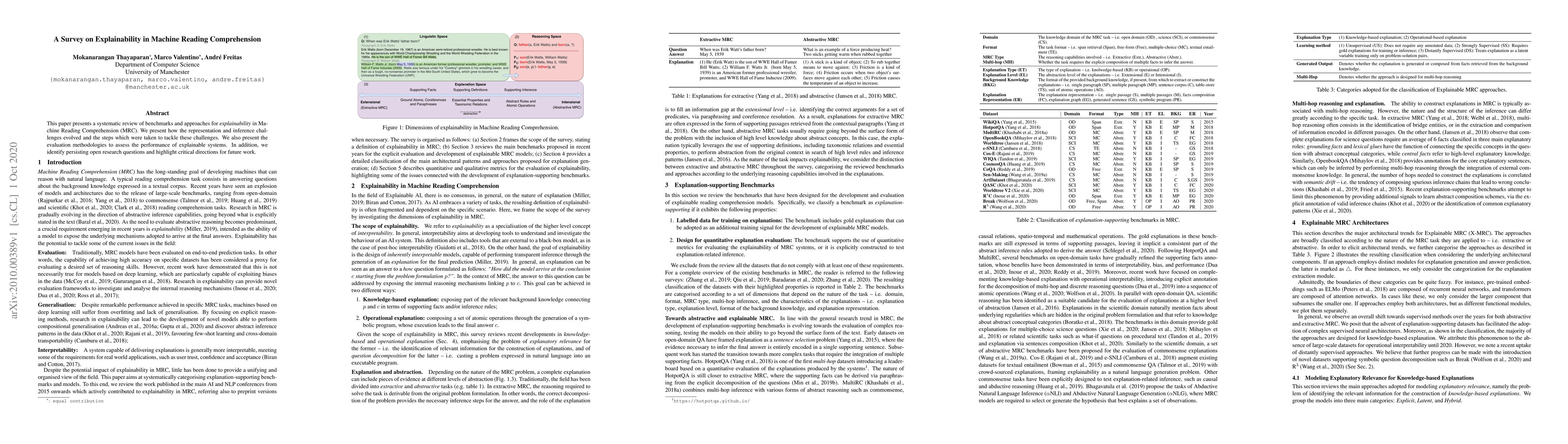 This paper presents a systematic review of benchmarks and approaches for explainability in Machine Reading Comprehension (MRC). We present how the representation and inference challenges evolved and the steps which were taken to tackle these challenges. We also present the evaluation methodologies to assess the performance of explainable systems. In addition, we identify persisting open research questions and highlight critical directions for future work.