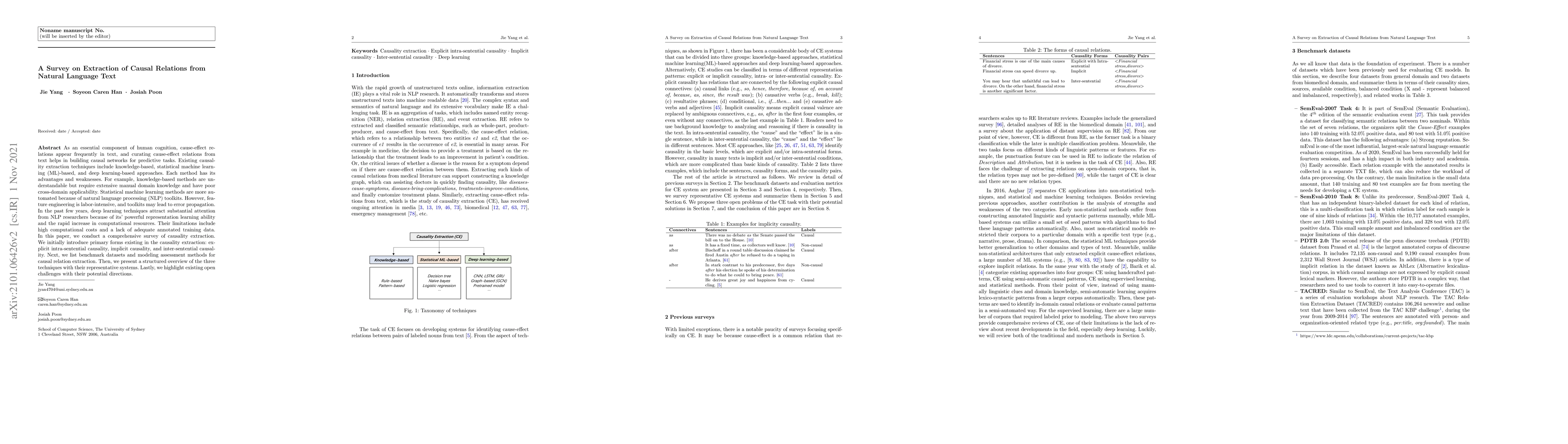 This paper surveys methods for extracting causal relations from natural language text, categorizing them into knowledge-based, statistical machine learning, and deep learning approaches. It highlights the strengths and weaknesses of each method, emphasizing the challenges of computational costs and data scarcity in deep learning.