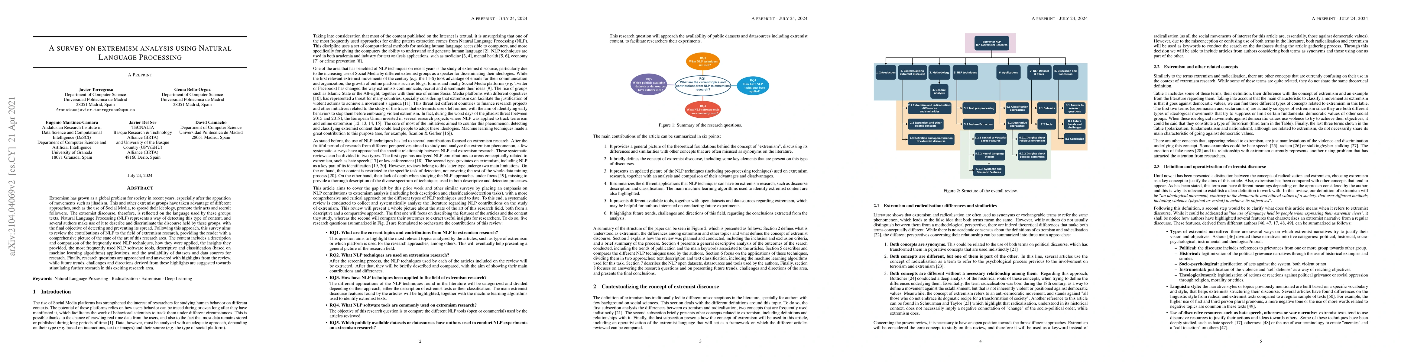 Extremism research has grown as an open problem for several countries during recent years, especially due to the apparition of movements such as jihadism. This and other extremist groups have taken advantage of different approaches, such as the use of Social Media, to spread their ideology, promote their acts and recruit followers. Natural Language Processing (NLP) represents a way of detecting this type of content, and several authors make use of it to describe and discriminate the discourse held by this groups, with the final objective of detecting and preventing its spread. This survey aims to review the contributions of NLP to the field of extremism research, providing the reader with a comprehensive picture of the state of the art of this research area. The content includes a description and comparison of the frequently used NLP techniques, how they were applied, the insights they provided, the most frequently used NLP software tools and the availability of datasets and data sources for research. Finally, research questions are approached and answered with highlights from the review, while future trends, challenges and directions derived from these highlights are suggested.