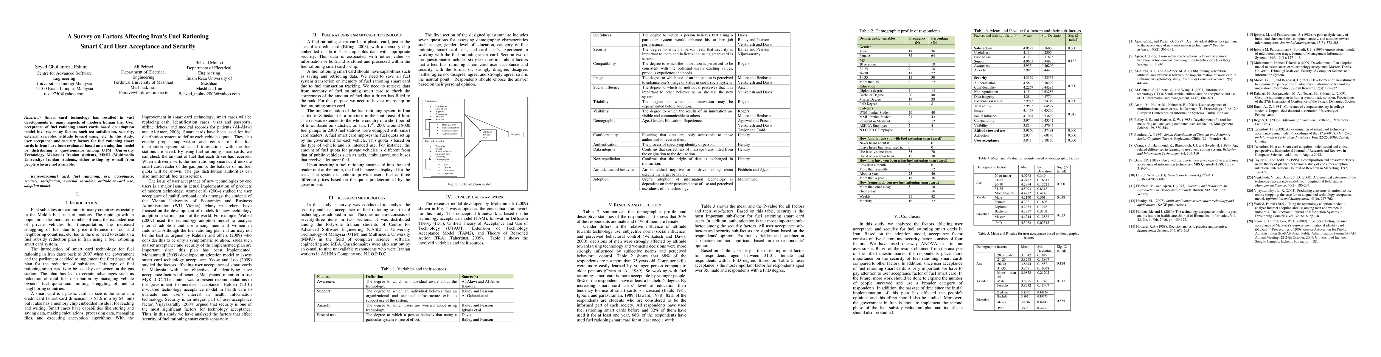 Smart card technology has resulted in vast developments in many aspects of modern human life. User acceptance of fuel rationing smart cards based on adoption model involves many factors such as: satisfaction, security, external variables, attitude toward using, etc. In this study, user acceptance and security factors for fuel rationing smart cards in Iran have been evaluated based on an adoption model by distributing a questionnaire among UTM (University Technology Malaysia) Iranian students, MMU (Multimedia University) Iranian students, either asking by e-mail from people who are not available.