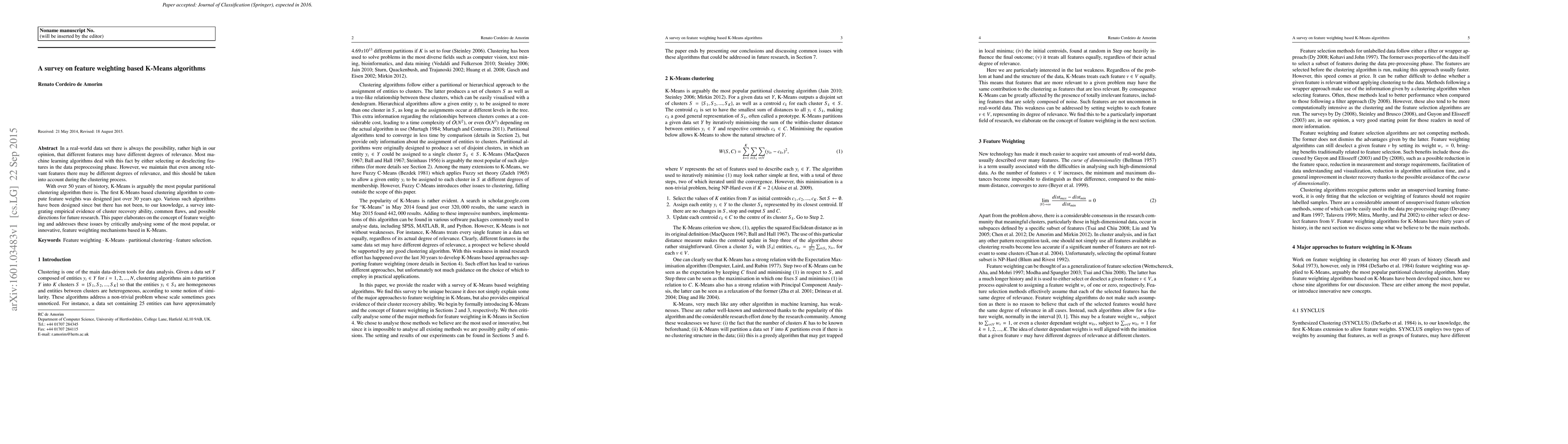 In a real-world data set there is always the possibility, rather high in our opinion, that different features may have different degrees of relevance. Most machine learning algorithms deal with this fact by either selecting or deselecting features in the data preprocessing phase. However, we maintain that even among relevant features there may be different degrees of relevance, and this should be taken into account during the clustering process. With over 50 years of history, K-Means is arguably the most popular partitional clustering algorithm there is. The first K-Means based clustering algorithm to compute feature weights was designed just over 30 years ago. Various such algorithms have been designed since but there has not been, to our knowledge, a survey integrating empirical evidence of cluster recovery ability, common flaws, and possible directions for future research. This paper elaborates on the concept of feature weighting and addresses these issues by critically analysing some of the most popular, or innovative, feature weighting mechanisms based in K-Means.