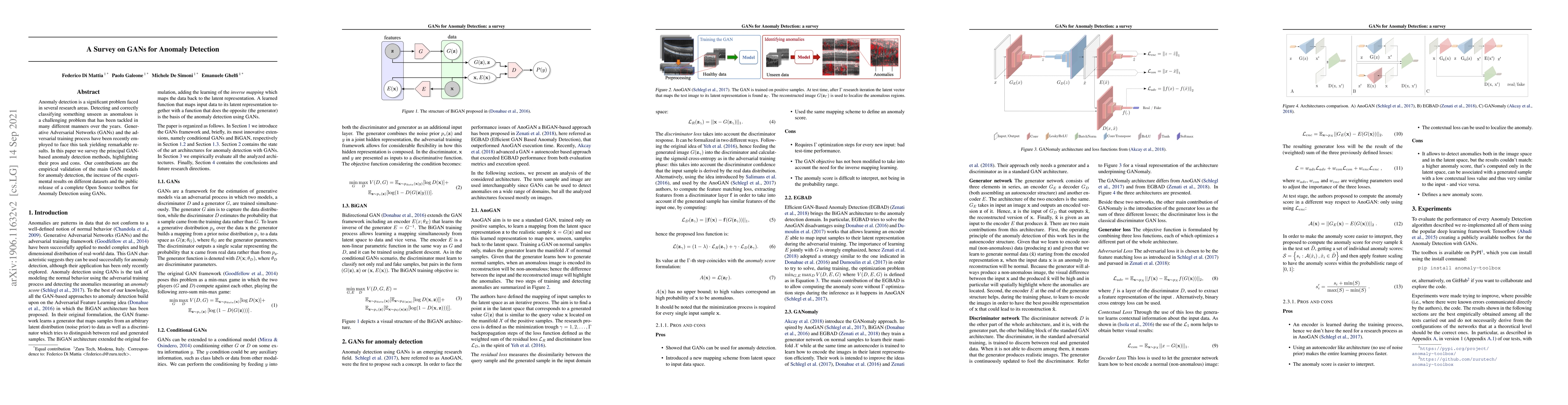 Anomaly detection is a significant problem faced in several research areas. Detecting and correctly classifying something unseen as anomalous is a challenging problem that has been tackled in many different manners over the years. Generative Adversarial Networks (GANs) and the adversarial training process have been recently employed to face this task yielding remarkable results. In this paper we survey the principal GAN-based anomaly detection methods, highlighting their pros and cons. Our contributions are the empirical validation of the main GAN models for anomaly detection, the increase of the experimental results on different datasets and the public release of a complete Open Source toolbox for Anomaly Detection using GANs.