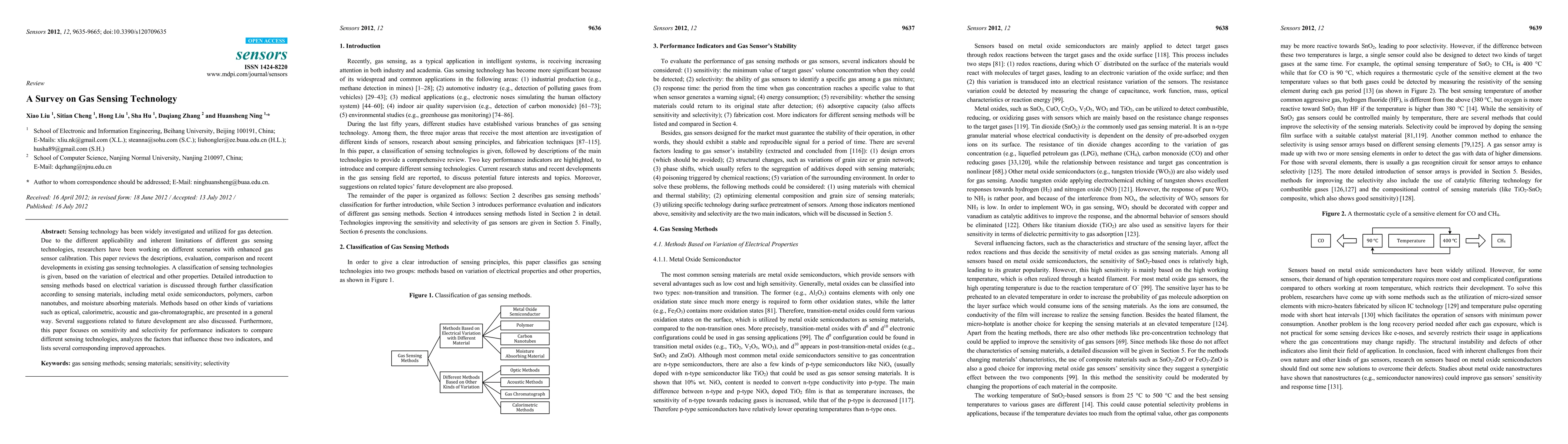 Sensing technology has been widely investigated and utilized for gas detection. Due to the different applicability and inherent limitations of different gas sensing technologies, researchers have been working on different scenarios with enhanced gas sensor calibration. This paper reviews the descriptions, evaluation, comparison and recent developments in existing gas sensing technologies. A classification of sensing technologies is given, based on the variation of electrical and other properties. Detailed introduction to sensing methods based on electrical variation is discussed through further classification according to sensing materials, including metal oxide semiconductors, polymers, carbon nanotubes, and moisture absorbing materials. Methods based on other kinds of variations such as optical, calorimetric, acoustic and gas-chromatographic, are presented in a general way. Several suggestions related to future development are also discussed. Furthermore, this paper focuses on sensitivity and selectivity for performance indicators to compare different sensing technologies, analyzes the factors that influence these two indicators, and lists several corresponding improved approaches.
