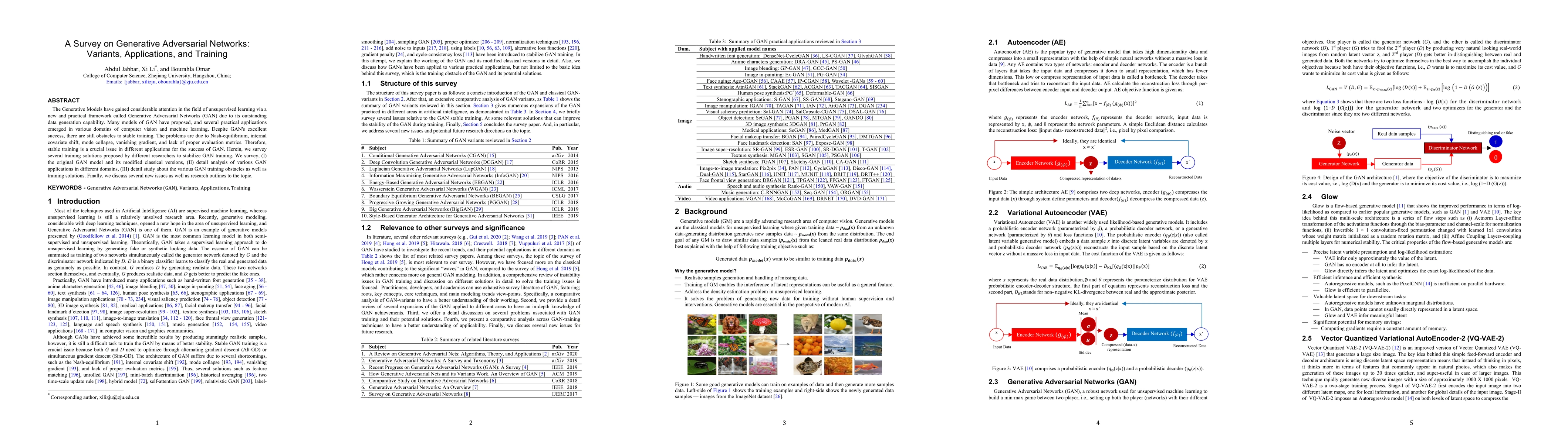 This paper surveys Generative Adversarial Networks (GANs), highlighting their variants, applications, and training challenges. It reviews the original GAN model and its modifications, explores GAN applications across various domains, and discusses obstacles to stable training along with proposed solutions.