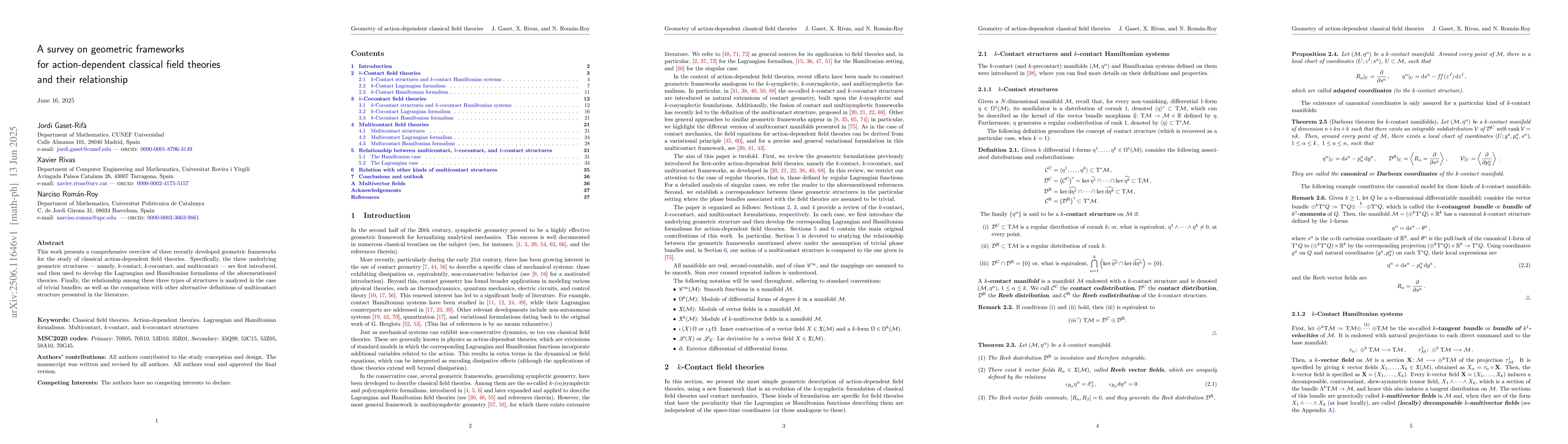 This work presents a comprehensive overview of three recently developed geometric frameworks for the study of classical action-dependent field theories. Specifically, the three underlying geometric structures - namely, k-contact, k-cocontact, and multicontact - are first introduced, and then used to develop the Lagrangian and Hamiltonian formalisms of the aforementioned theories. Finally, the relationship among these three types of structures is analyzed in the case of trivial bundles; as well as the comparison with other alternative definitions of multicontact structure presented in the literature.