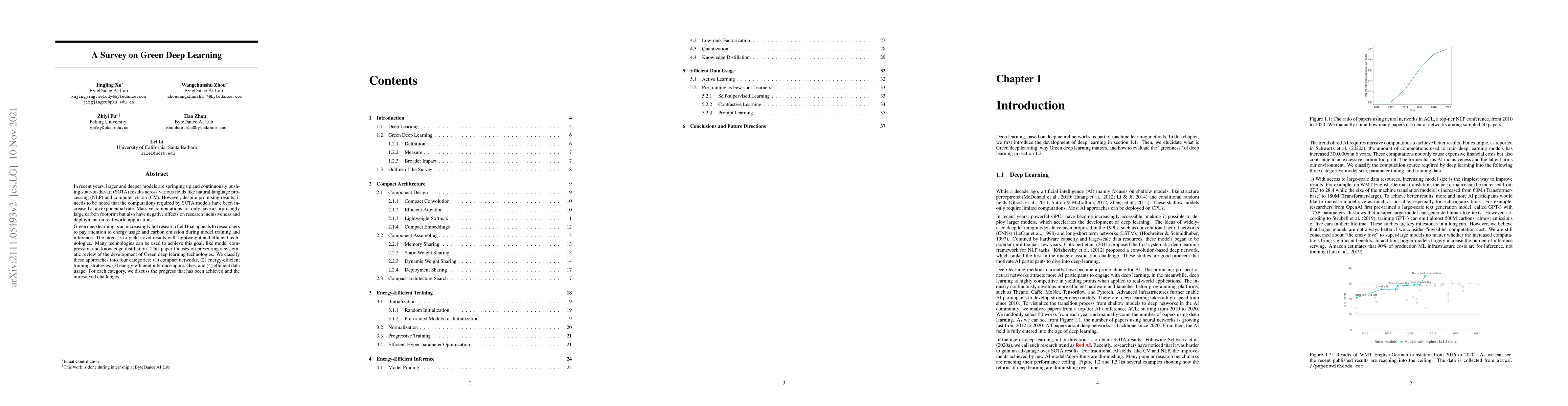 A survey on green deep learning technologies focuses on reducing energy consumption in AI models through compact networks, efficient training strategies, and data usage optimization. The study aims to achieve lightweight and efficient technologies while maintaining state-of-the-art results.