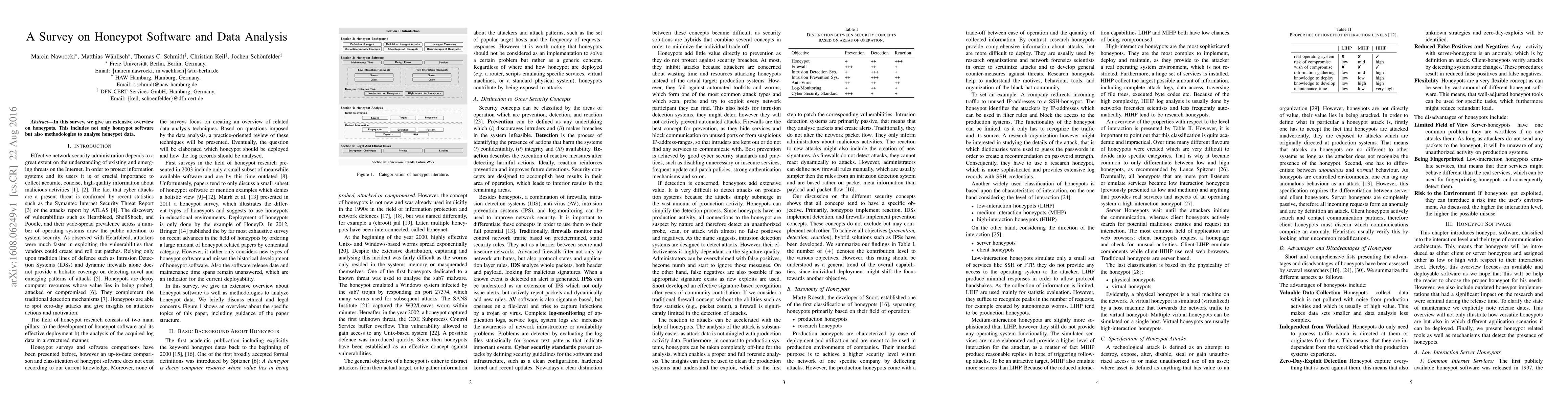 In this survey, we give an extensive overview on honeypots. This includes not only honeypot software but also methodologies to analyse honeypot data.