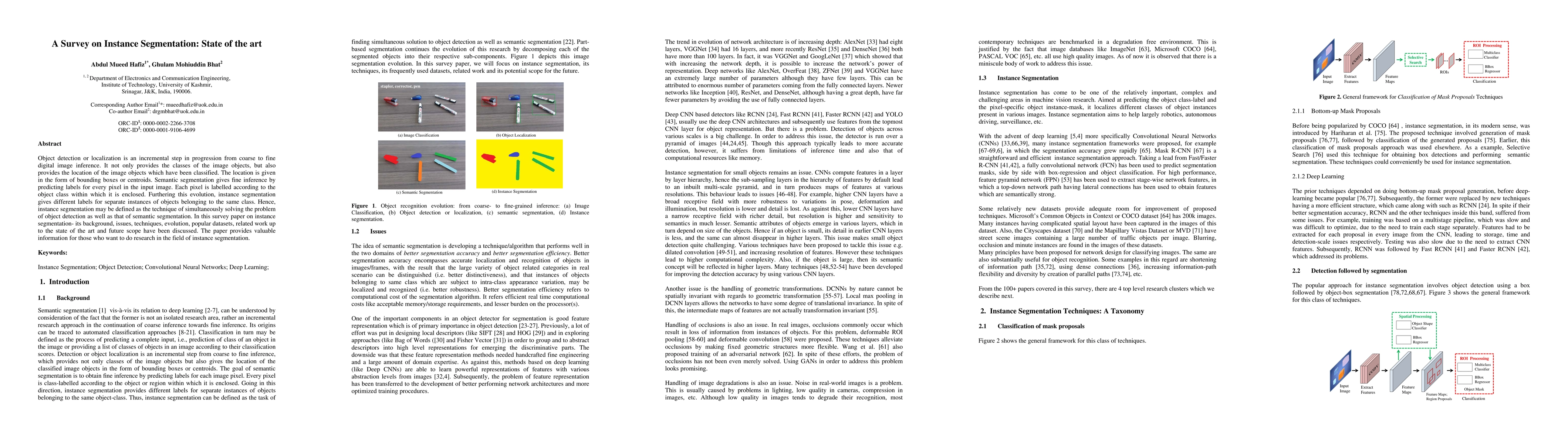Object detection or localization is an incremental step in progression from coarse to fine digital image inference. It not only provides the classes of the image objects, but also provides the location of the image objects which have been classified. The location is given in the form of bounding boxes or centroids. Semantic segmentation gives fine inference by predicting labels for every pixel in the input image. Each pixel is labelled according to the object class within which it is enclosed. Furthering this evolution, instance segmentation gives different labels for separate instances of objects belonging to the same class. Hence, instance segmentation may be defined as the technique of simultaneously solving the problem of object detection as well as that of semantic segmentation. In this survey paper on instance segmentation -- its background, issues, techniques, evolution, popular datasets, related work up to the state of the art and future scope have been discussed. The paper provides valuable information for those who want to do research in the field of instance segmentation.