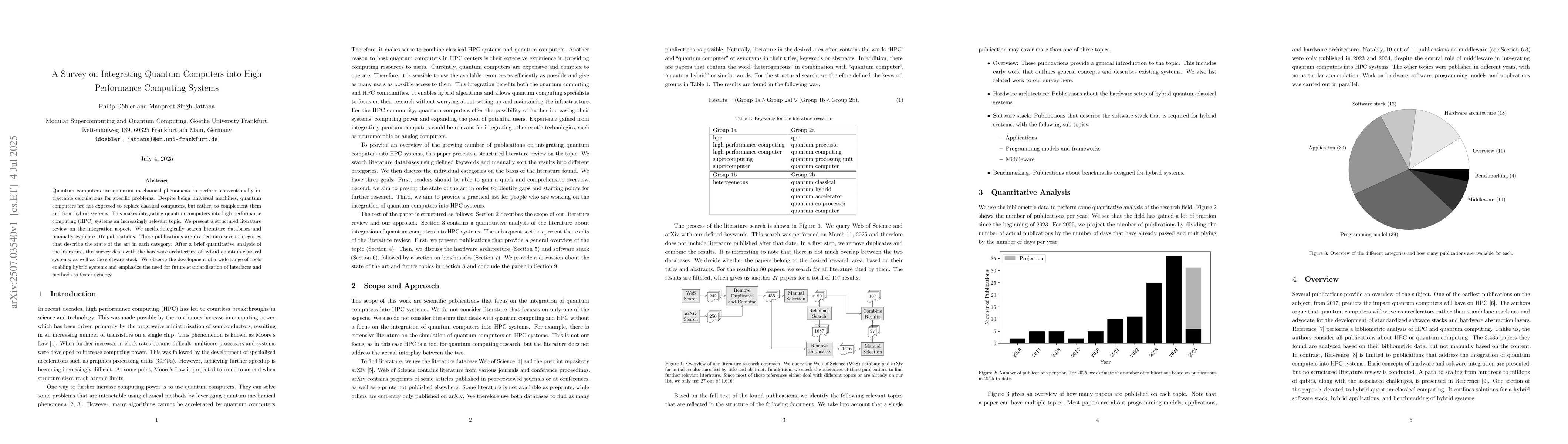 Quantum computers use quantum mechanical phenomena to perform conventionally intractable calculations for specific problems. Despite being universal machines, quantum computers are not expected to replace classical computers, but rather, to complement them and form hybrid systems. This makes integrating quantum computers into high performance computing (HPC) systems an increasingly relevant topic. We present a structured literature review on the integration aspect. We methodologically search literature databases and manually evaluate 107 publications. These publications are divided into seven categories that describe the state of the art in each category. After a brief quantitative analysis of the literature, this survey deals with the hardware architecture of hybrid quantum-classical systems, as well as the software stack. We observe the development of a wide range of tools enabling hybrid systems and emphasize the need for future standardization of interfaces and methods to foster synergy.