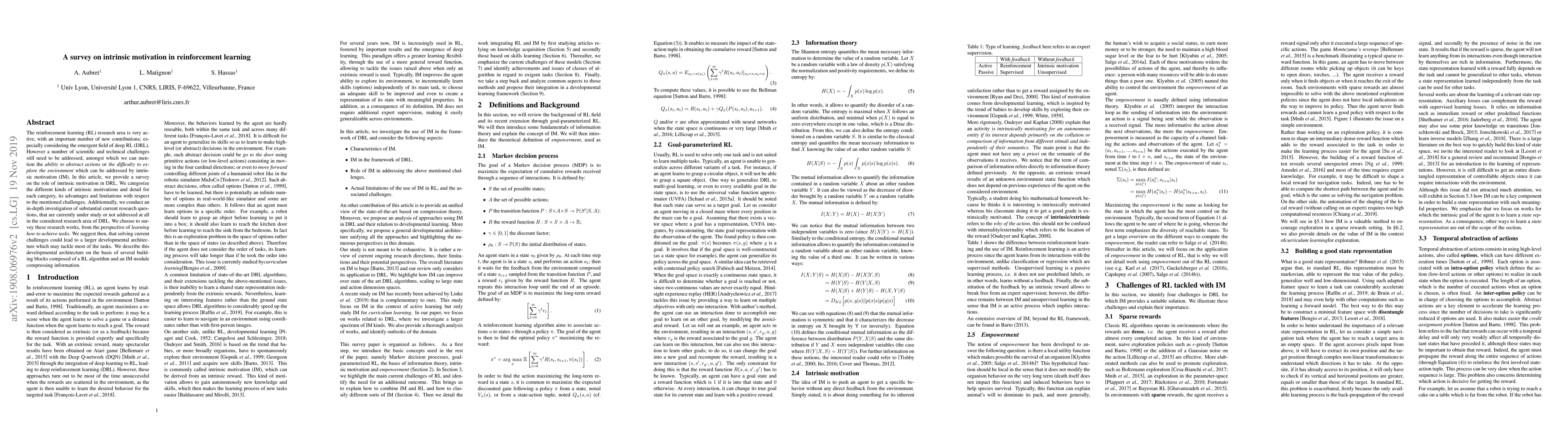 The reinforcement learning (RL) research area is very active, with an important number of new contributions; especially considering the emergent field of deep RL (DRL). However a number of scientific and technical challenges still need to be addressed, amongst which we can mention the ability to abstract actions or the difficulty to explore the environment which can be addressed by intrinsic motivation (IM). In this article, we provide a survey on the role of intrinsic motivation in DRL. We categorize the different kinds of intrinsic motivations and detail for each category, its advantages and limitations with respect to the mentioned challenges. Additionnally, we conduct an in-depth investigation of substantial current research questions, that are currently under study or not addressed at all in the considered research area of DRL. We choose to survey these research works, from the perspective of learning how to achieve tasks. We suggest then, that solving current challenges could lead to a larger developmental architecture which may tackle most of the tasks. We describe this developmental architecture on the basis of several building blocks composed of a RL algorithm and an IM module compressing information.