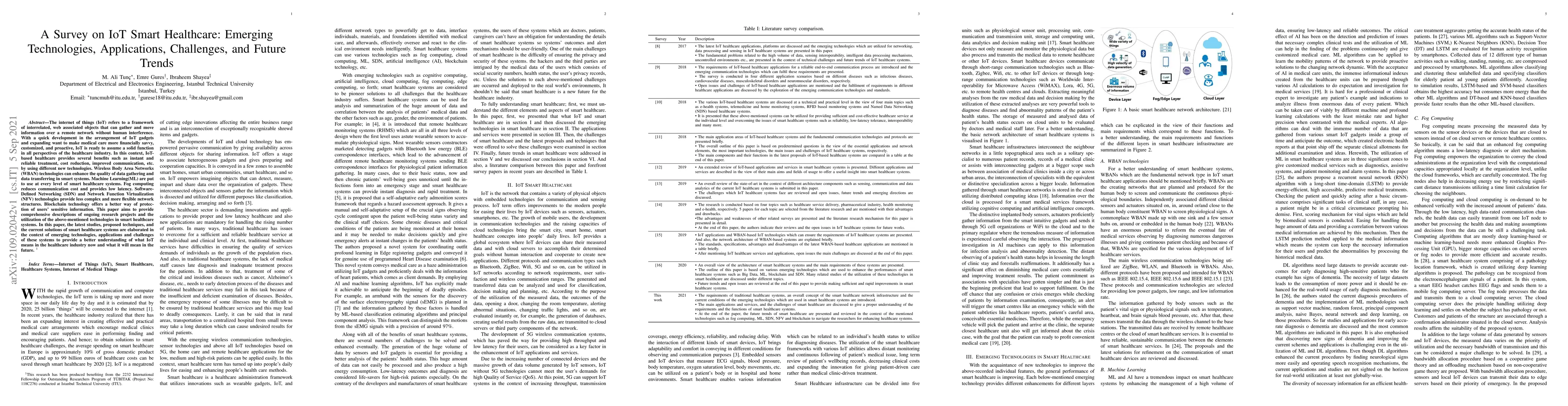 This paper surveys IoT smart healthcare, detailing emerging technologies like Wireless Body Area Networks, Machine Learning, Fog computing, SDN, NFV, and Blockchain. It explores their applications, benefits, and challenges, and outlines future trends in IoT-based healthcare systems.