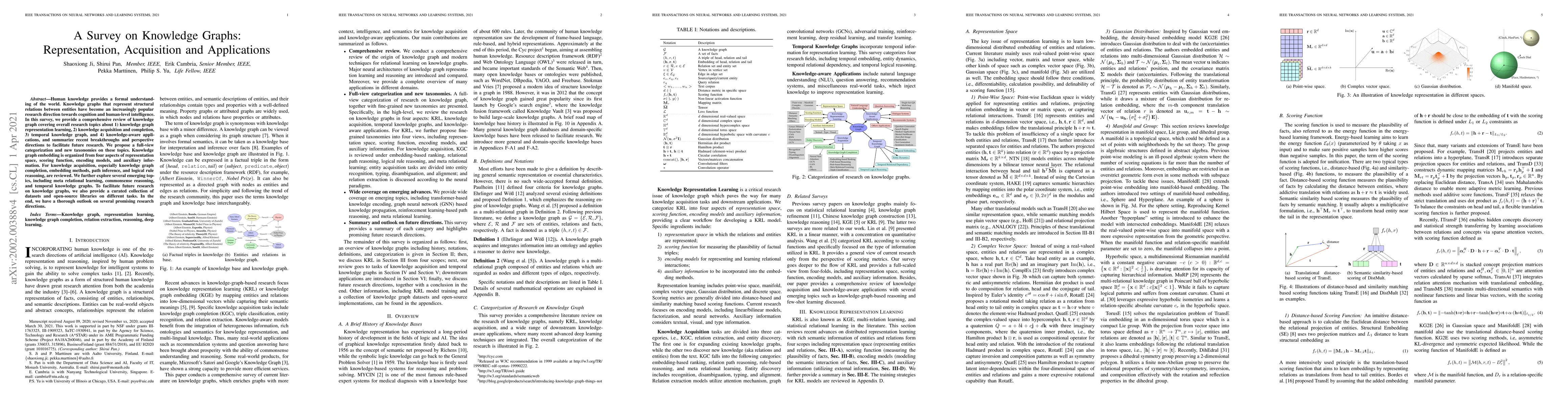 This survey provides a comprehensive review of knowledge graph research, covering representation learning, acquisition and completion, temporal aspects, and knowledge-aware applications. It categorizes knowledge graph embedding methods and discusses emerging topics like meta relational learning and temporal knowledge graphs, along with a curated collection of datasets and libraries to support future research.