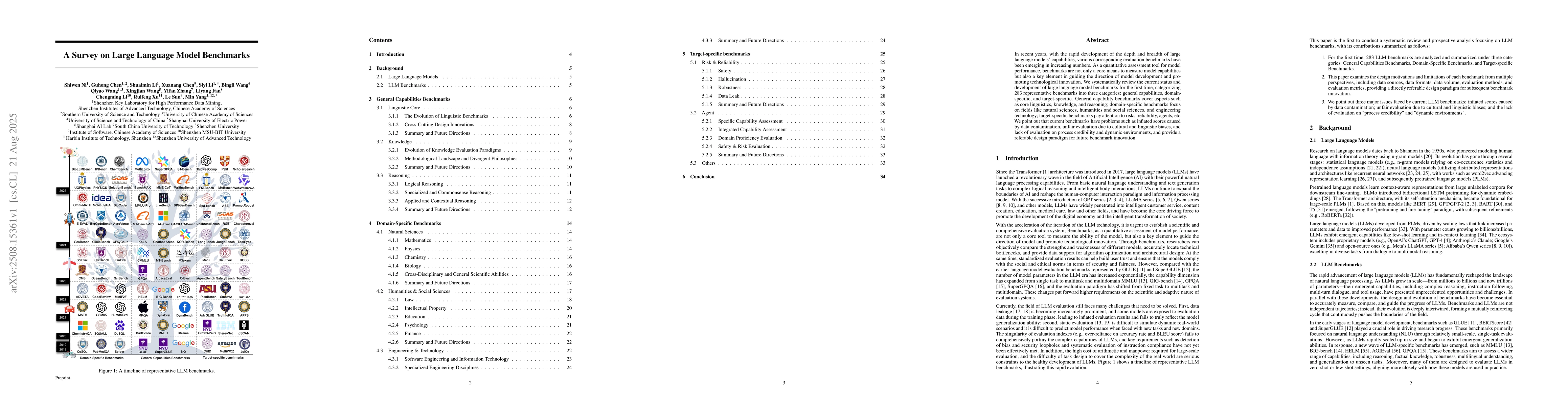 In recent years, with the rapid development of the depth and breadth of large language models' capabilities, various corresponding evaluation benchmarks have been emerging in increasing numbers. As a quantitative assessment tool for model performance, benchmarks are not only a core means to measure model capabilities but also a key element in guiding the direction of model development and promoting technological innovation. We systematically review the current status and development of large language model benchmarks for the first time, categorizing 283 representative benchmarks into three categories: general capabilities, domain-specific, and target-specific. General capability benchmarks cover aspects such as core linguistics, knowledge, and reasoning; domain-specific benchmarks focus on fields like natural sciences, humanities and social sciences, and engineering technology; target-specific benchmarks pay attention to risks, reliability, agents, etc. We point out that current benchmarks have problems such as inflated scores caused by data contamination, unfair evaluation due to cultural and linguistic biases, and lack of evaluation on process credibility and dynamic environments, and provide a referable design paradigm for future benchmark innovation.