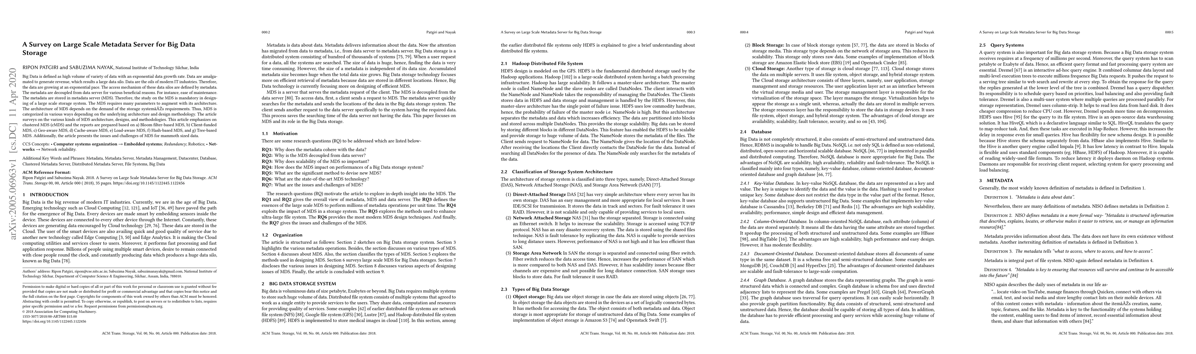 This research paper surveys various large-scale metadata server architectures for big data storage, highlighting key designs and methodologies, as well as challenges in handling massive data volumes.