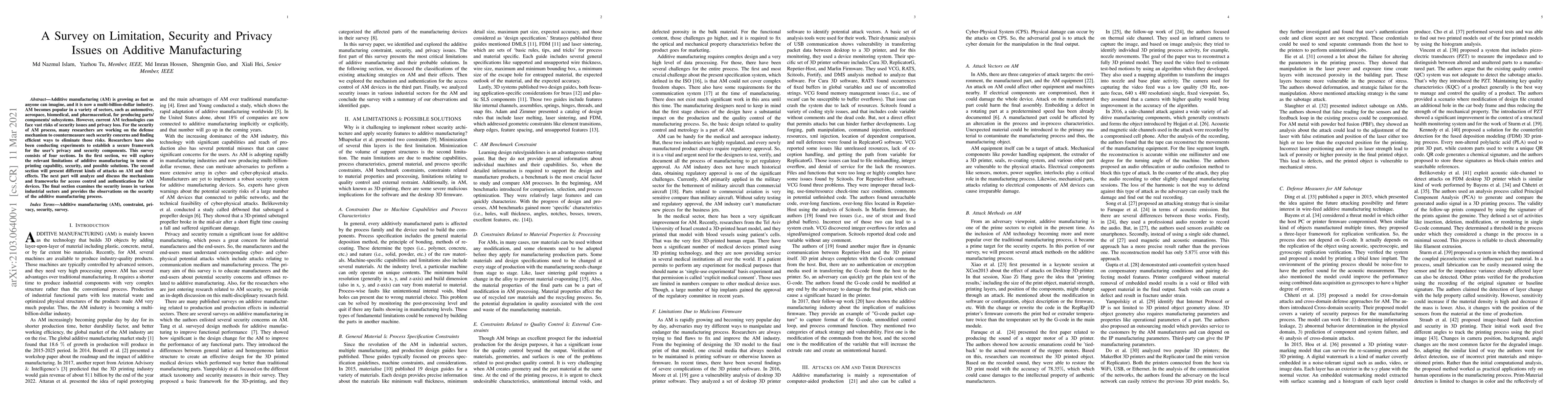 This survey investigates the limitations, security, and privacy issues in additive manufacturing (AM), highlighting risks in printing capability, potential attacks, and security mechanisms. It also examines sector-specific security concerns and proposes potential solutions.