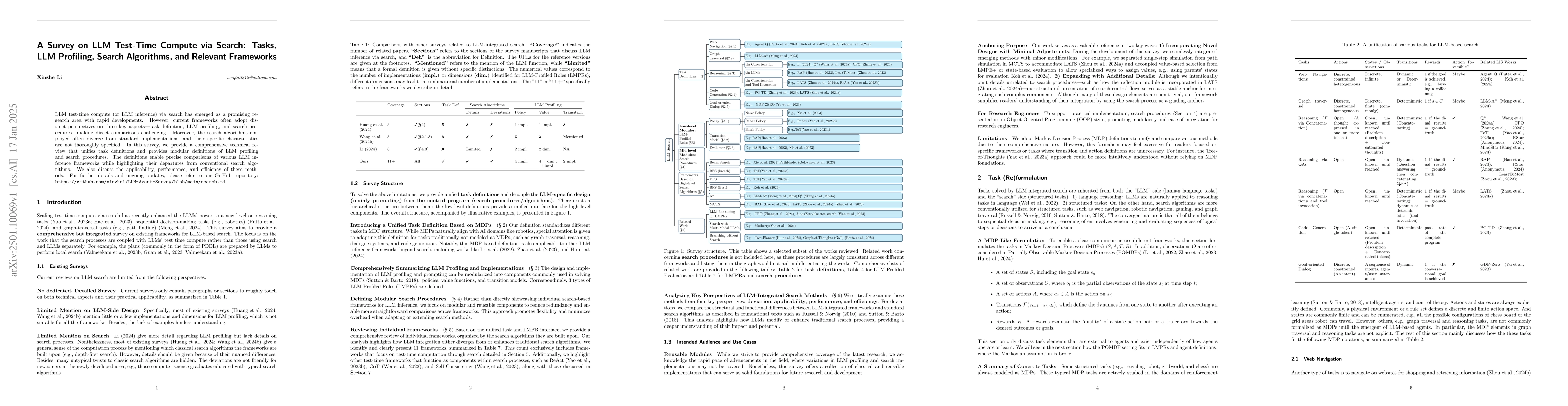 This survey consolidates and unifies the various frameworks and methodologies used for test-time compute in large language models (LLM) via search. It provides modular definitions for task definitions, LLM profiling, and search procedures, facilitating direct comparisons and highlighting deviations from standard search algorithms.
