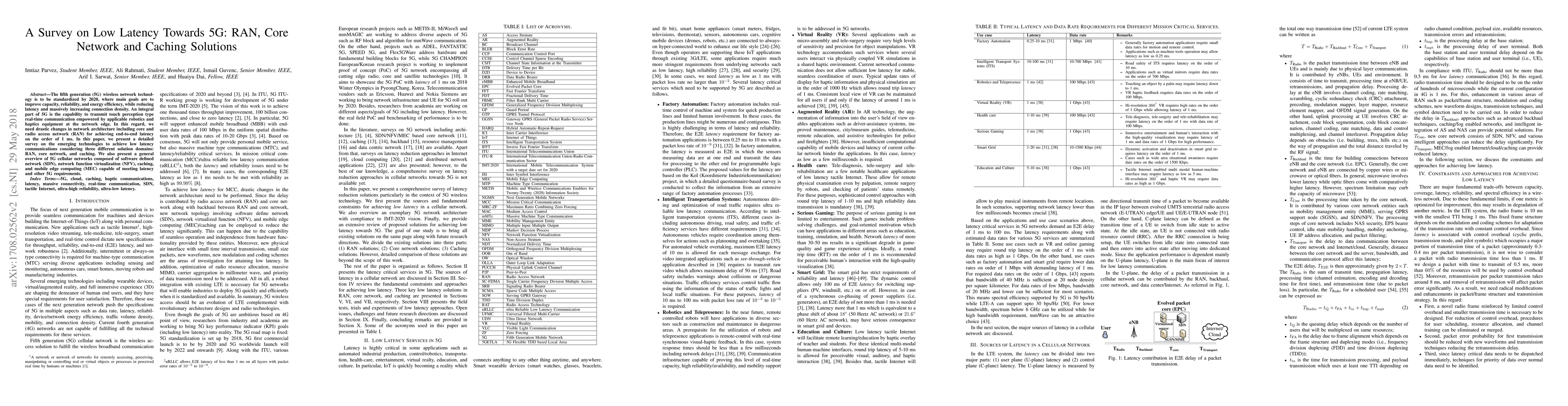 This paper surveys technologies for achieving low latency in 5G networks, focusing on Radio Access Network (RAN), core network, and caching solutions. It highlights the role of SDN, NFV, caching, and MEC in meeting 5G's stringent latency requirements.